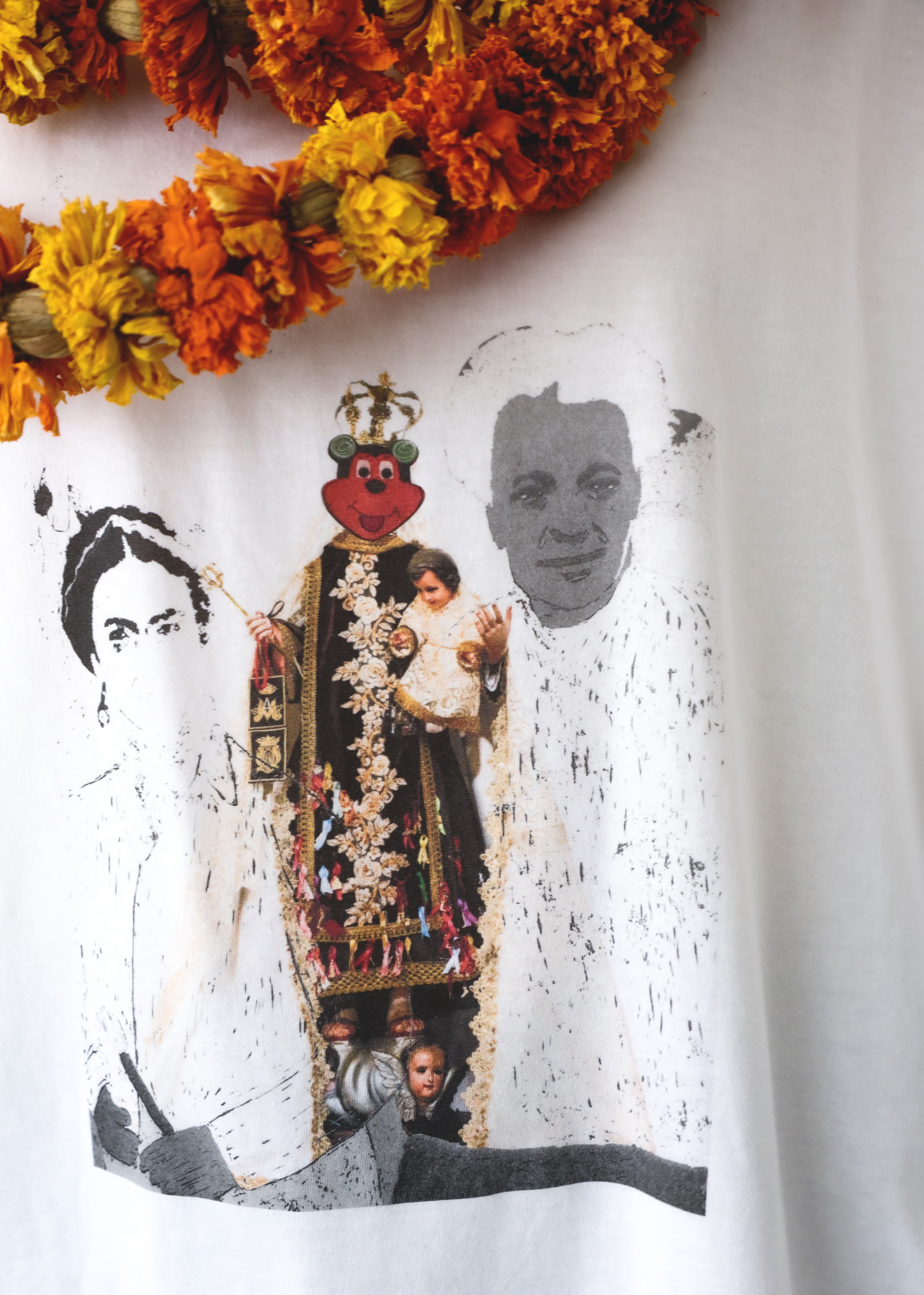 メキシコの伝説的な画家、フリーダ・カーロとパートナーのディエゴ、そしてカラフルな祭壇をモチーフにしたアートワークを大胆にプリント。白黒で描かれた肖像の中に、鮮やかな装飾をまとった人物が中央に配置され、どこか幻想的な世界観を演出しています。メキシコ文化において、死者の日は 「亡くなった人々と再会し、共に過ごす日」 とされ、写真や祭壇を飾ることでその魂を迎え入れる習慣があります。このデザインも、そうしたスピリチュアルな雰囲気を纏いながら、どこか遊び心を感じさせる仕上がりになっています。