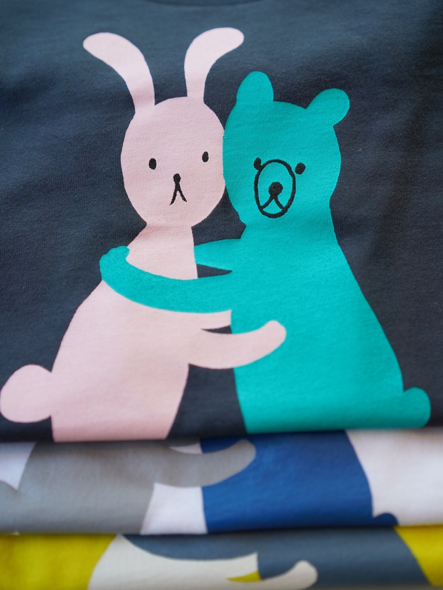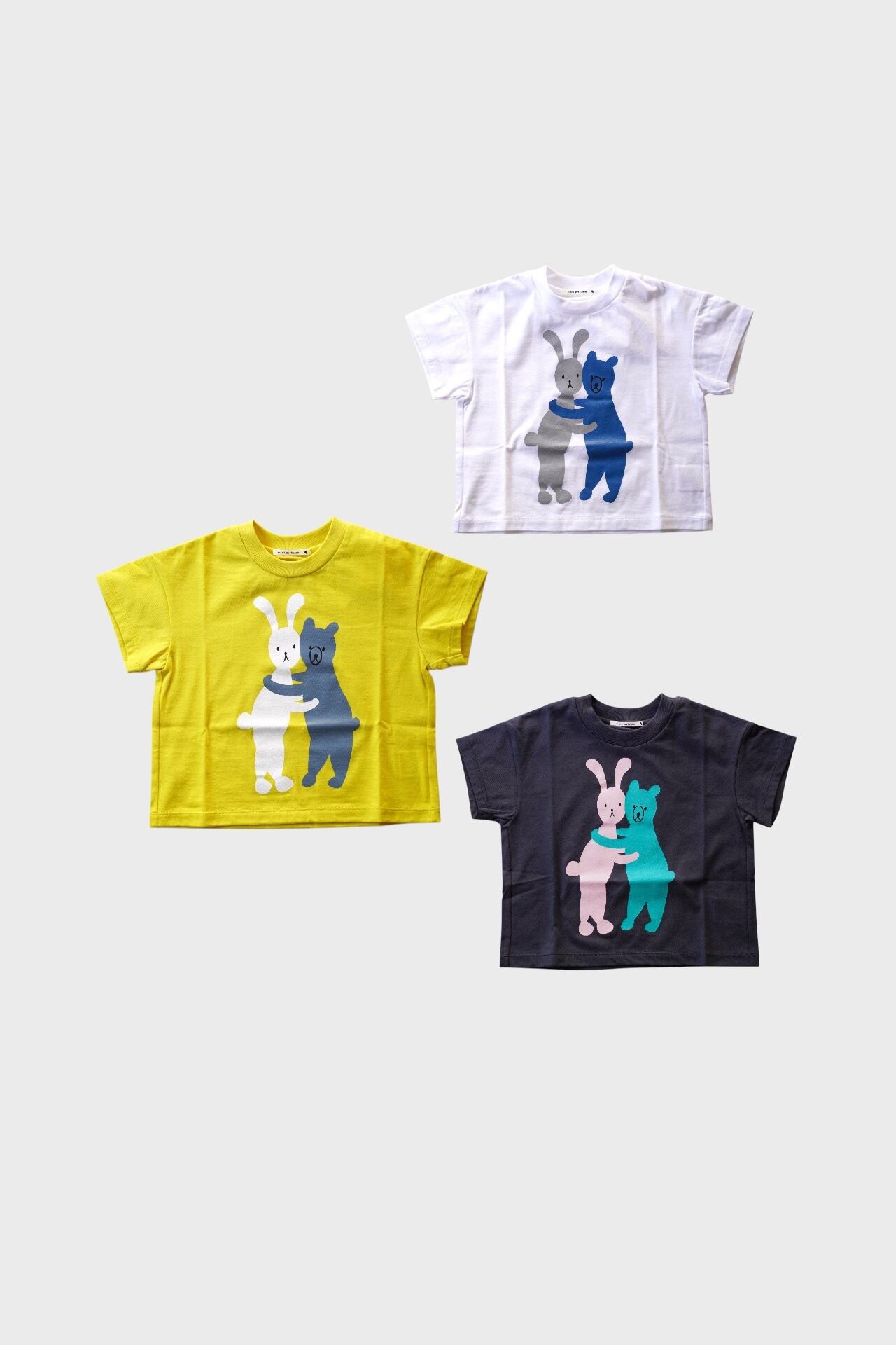 偶然に出会った動物たちが、お互いを讃えるように抱き合う姿を描いたTシャツ。 分厚すぎないコットンで、夏の日も心地よく。カラーはホワイト、イエロー、チャコール。 3色それぞれがベースに合わせた配色です。