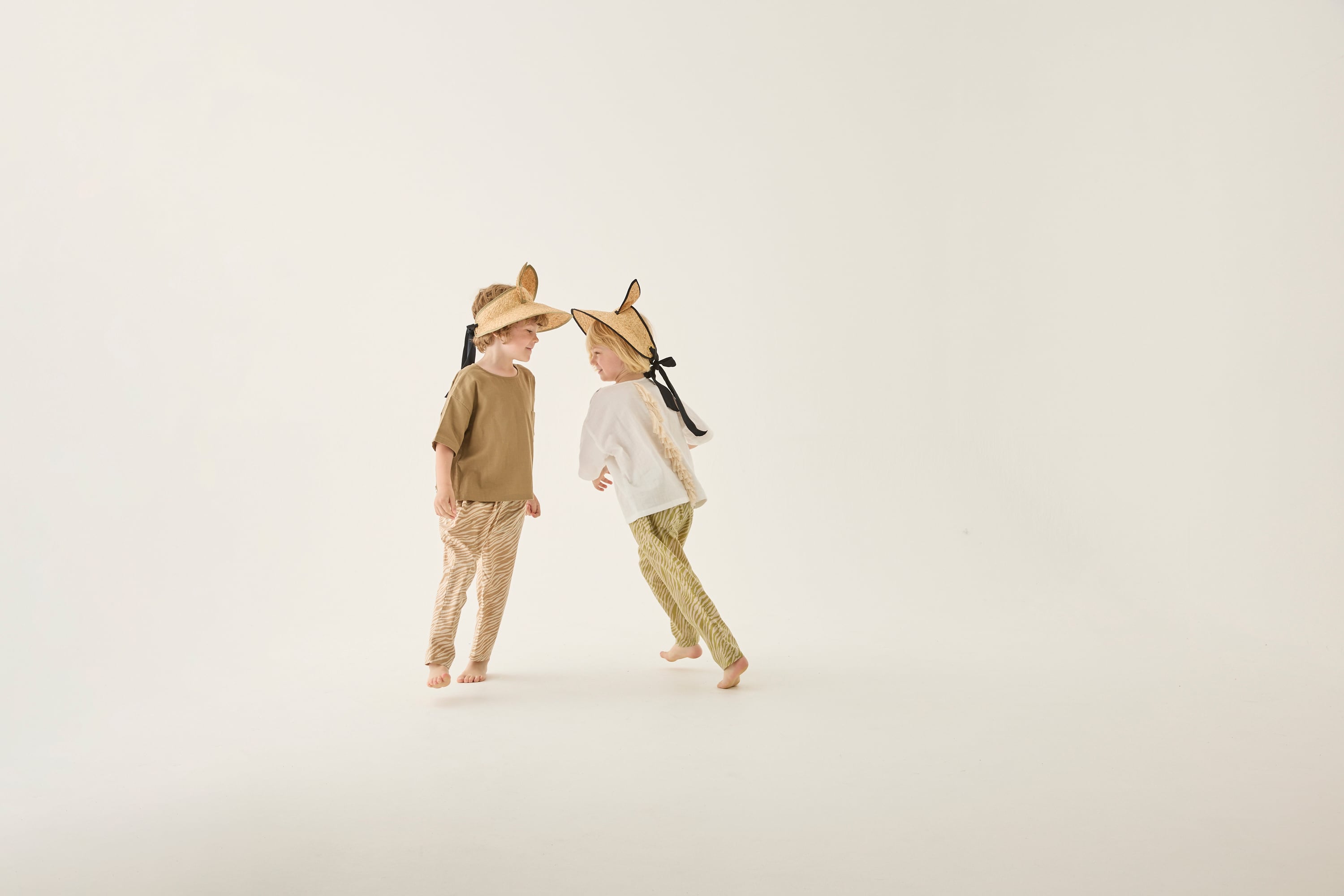 カラー配色の美しいゼブラ柄をプリントしたコットンタイプライターのシリーズ。高密度のコットン生地でパリッとした張り感があり薄いのに丈夫。肌アタリがひんやりと冷たく、吸水性、速乾性があり夏にぴったりの素材です。 キッズパンツはテーパードシルエットでウェストゴム仕様。
