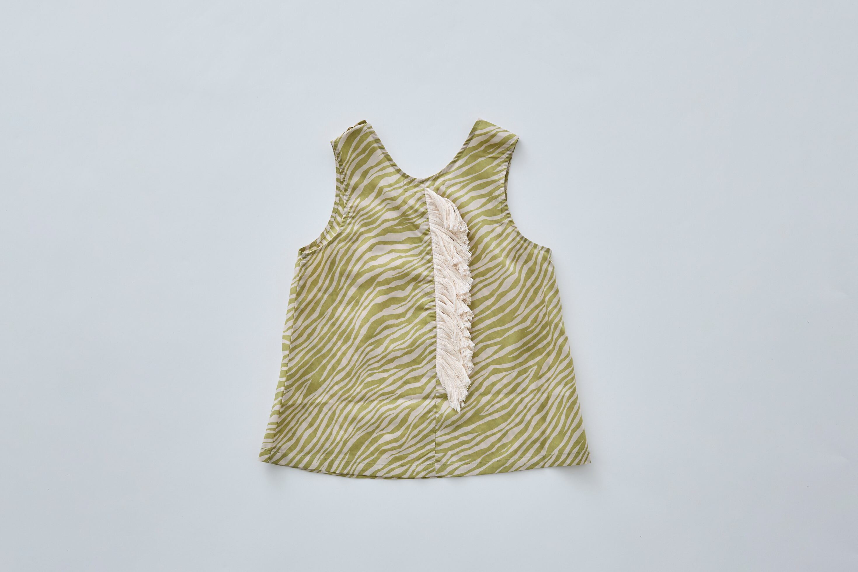 カラー配色の美しいゼブラ柄をプリントしたコットンタイプライターのシリーズ。高密度のコットン生地でパリッとした張り感があり薄いのに丈夫。肌アタリがひんやりと冷たく、吸水性、速乾性があり夏にぴったりの素材です。 新型のタンクトップの背中には、けもののたてがみを模したフリンジを付けたデザイン。