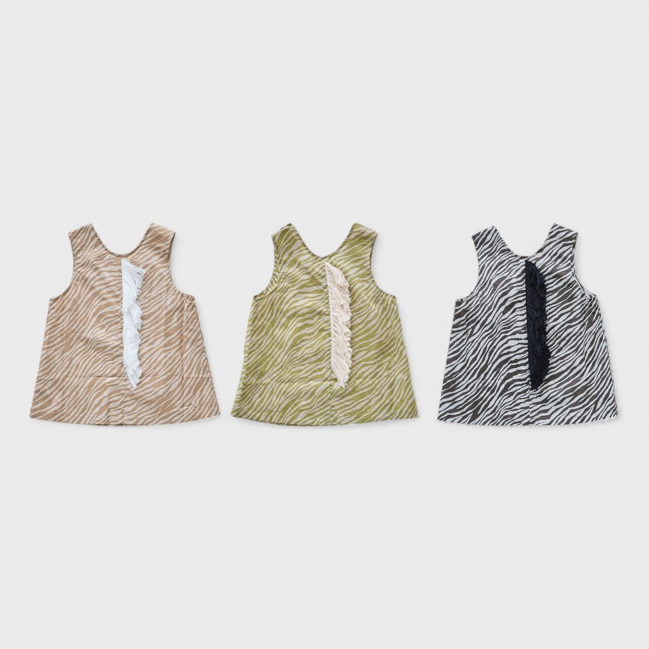 カラー配色の美しいゼブラ柄をプリントしたコットンタイプライターのシリーズ。高密度のコットン生地でパリッとした張り感があり薄いのに丈夫。肌アタリがひんやりと冷たく、吸水性、速乾性があり夏にぴったりの素材です。 新型のタンクトップの背中には、けもののたてがみを模したフリンジを付けたデザイン。
