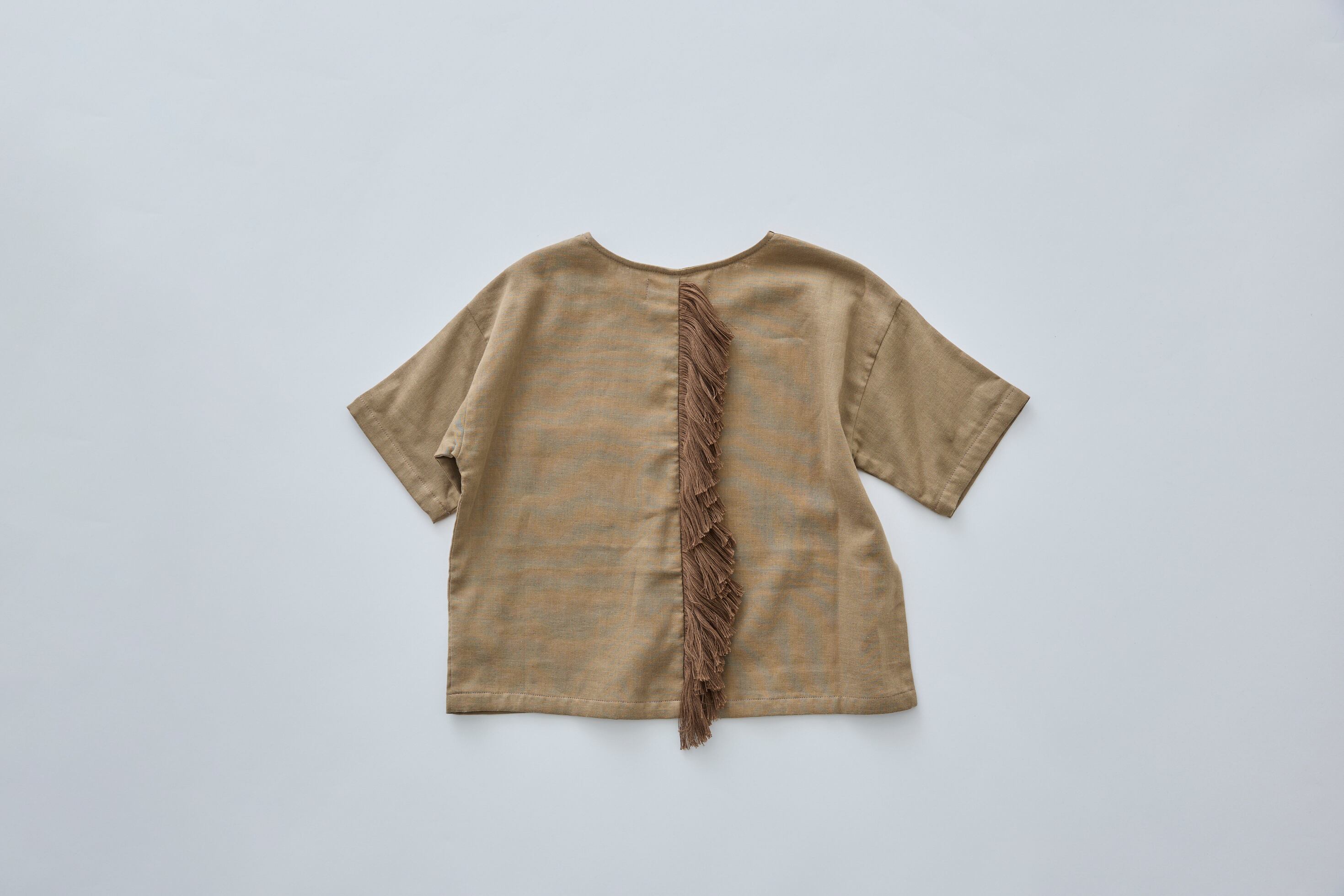 コットン100%の柔らかな二重ガーゼTシャツの背中に、コットン糸のフリンジをけもののたてがみのように付けたデザイン。 Tategami = Mane of a QiLin。 2021SSのテーマになったファンタジー小説「十二国記」に登場した聖獣 麒麟をイメージした麒麟Tの無地バージョン。