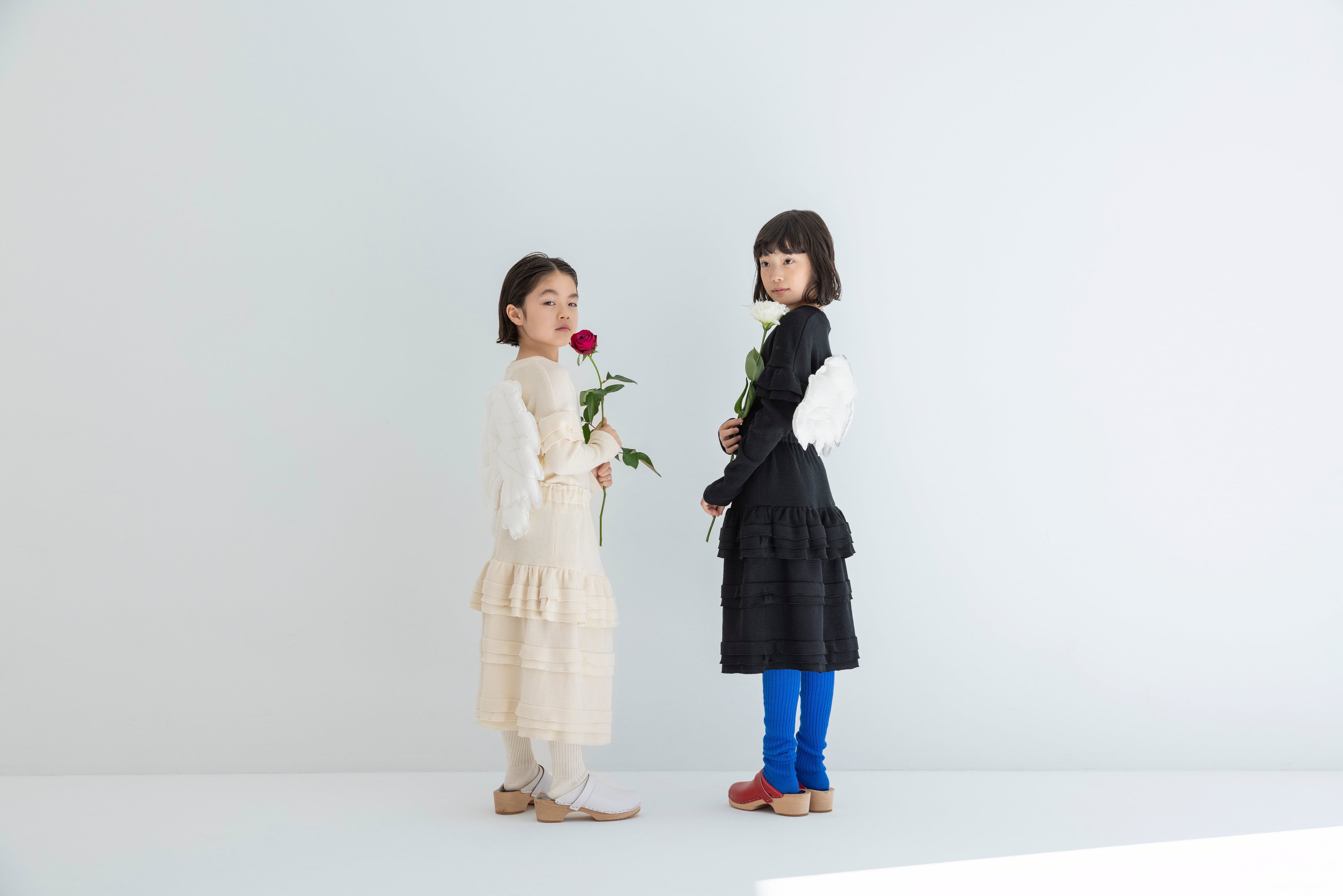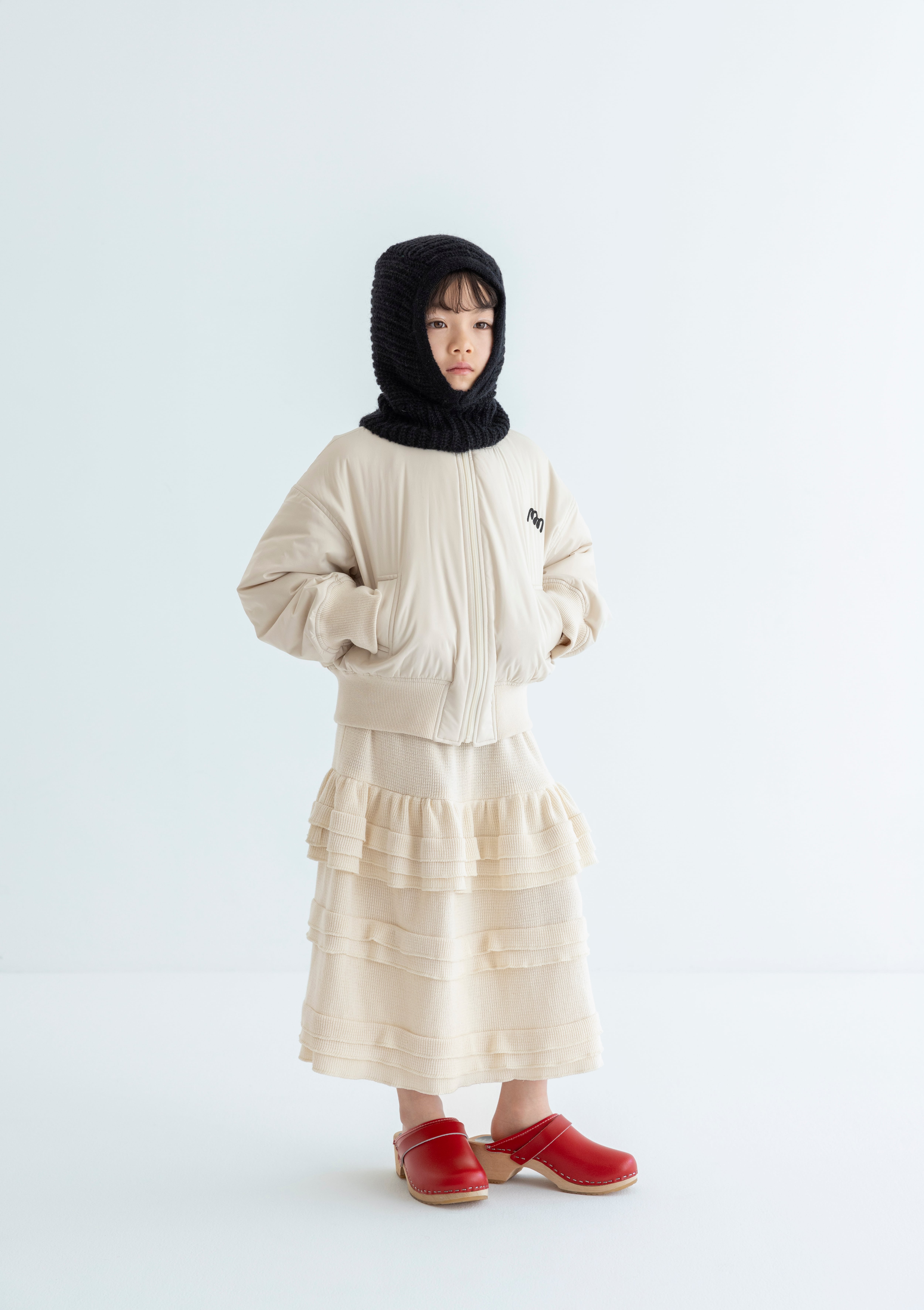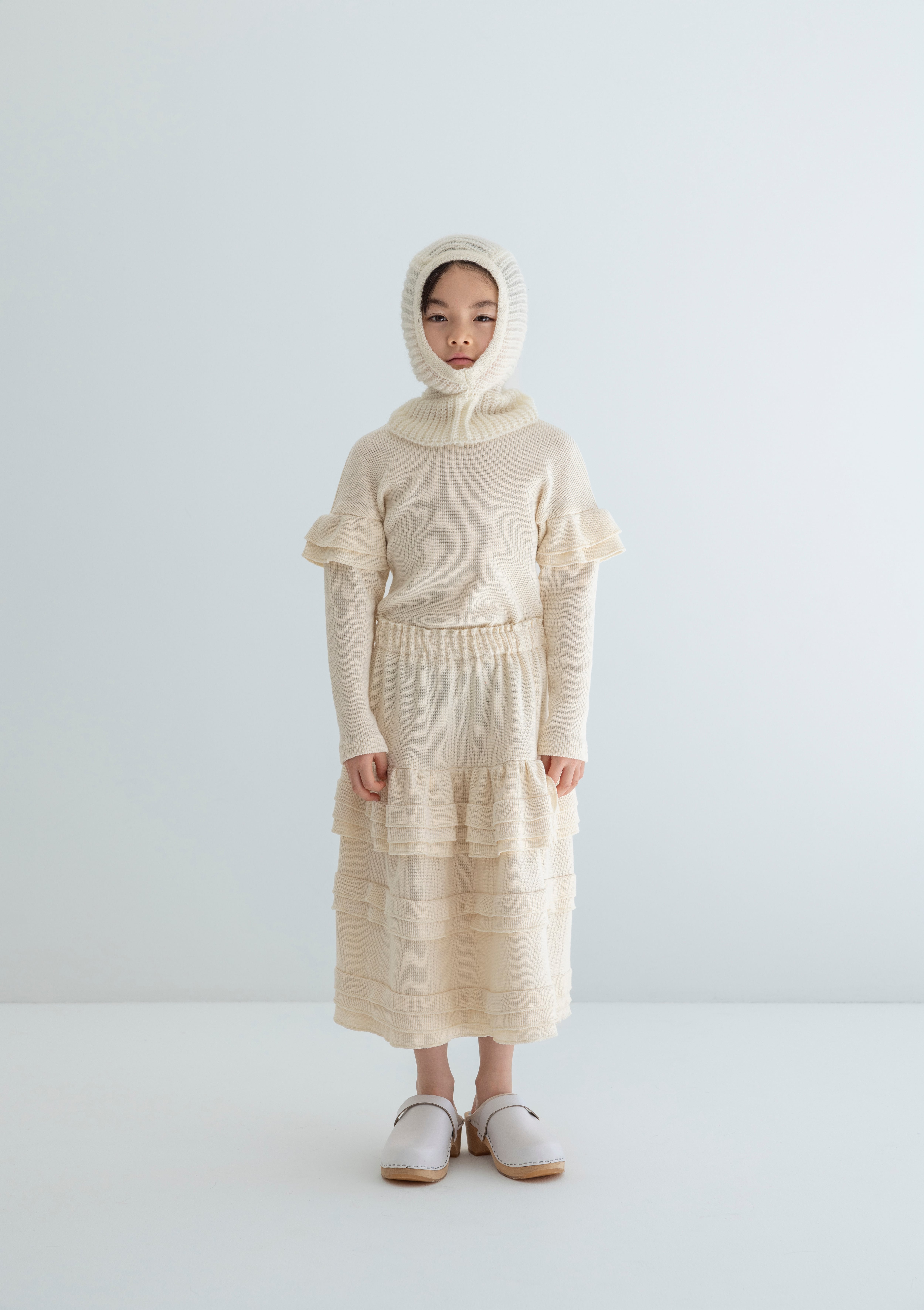 柔らかなニット素材を贅沢に使用し、ウエストはゴム仕様でリラックス感のある履き心地。裾にかけて重ねられたフリルが立体的な表情を生み、動くたびに軽やかな揺れを見せてくれます。ニットならではの暖かさと軽やかさを両立し、シーズンレスで活躍する一着です。
