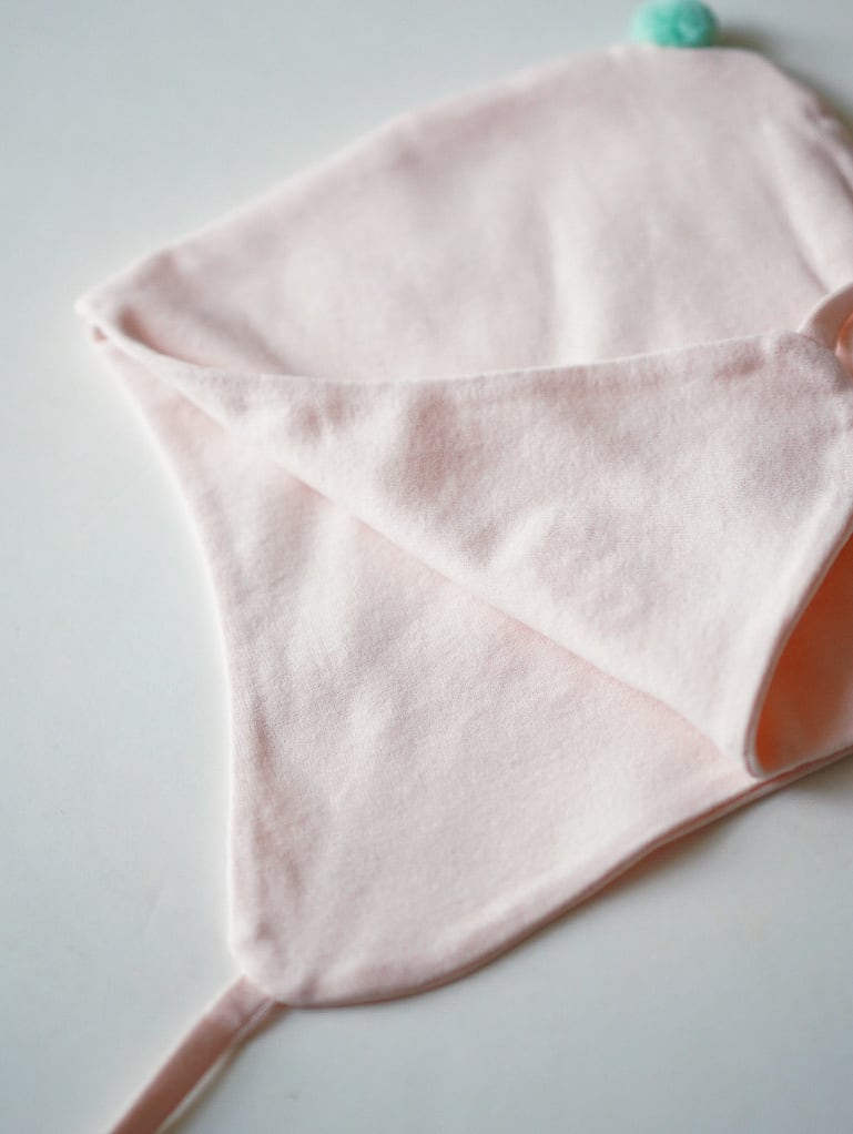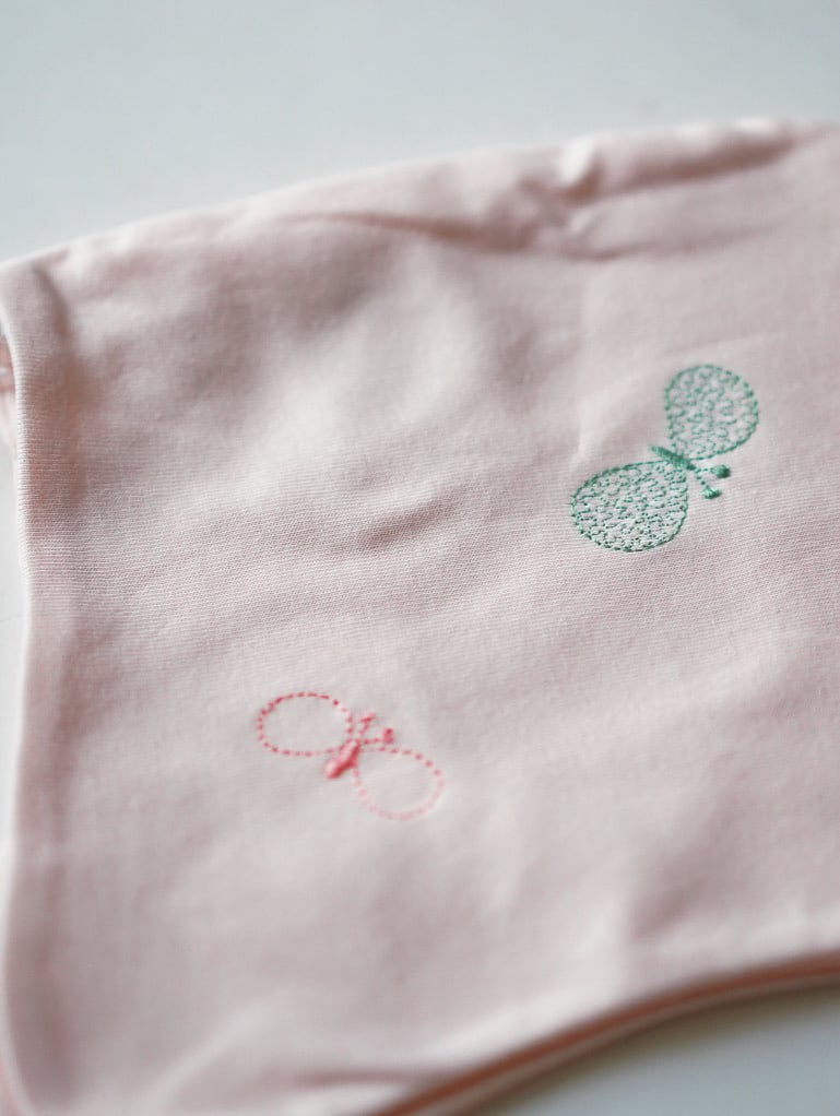 生地の中をふわりと蝶が舞う “choucho(チョウチョ)”。空気をまとったような刺繍の揺らぎが、やさしい風を感じさせるテキスタイルです。しっとりと上品な光沢をもつフライス素材は、とろけるような肌ざわり。赤ちゃんの小さな頭をやさしく包み込み、一日中快適に過ごせます。肌あたりがやわらかく、季節を問わず長く愛用できるのも魅力です。デザインを手がけるmina perhonenは、「100年先の暮らしを思う服づくり」を大切にしています。生地や刺繍に込められた物語は、日々の記憶として残り、贈りものとしても特別な一品に。