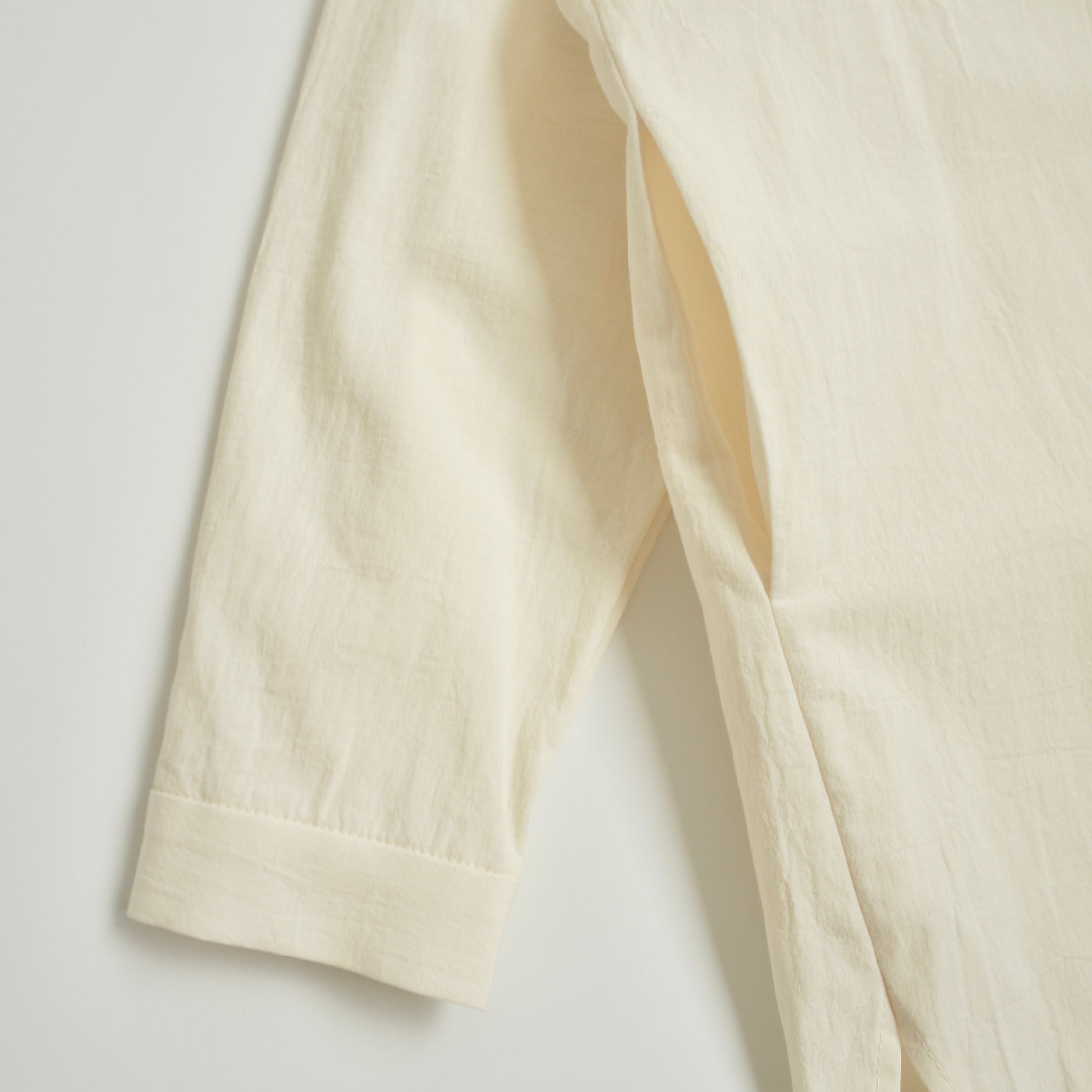 素材にはもみ洗いの様なワッシャー加工を施したナチュラルなオーガニックコットンのシャツ地を使用、細かなシワ感とドライタッチな素材感で素朴な雰囲気になっています。