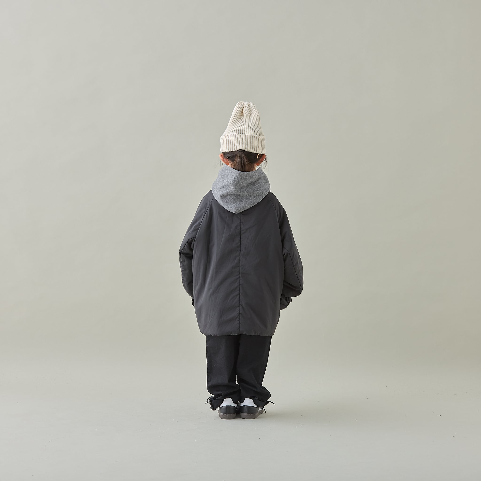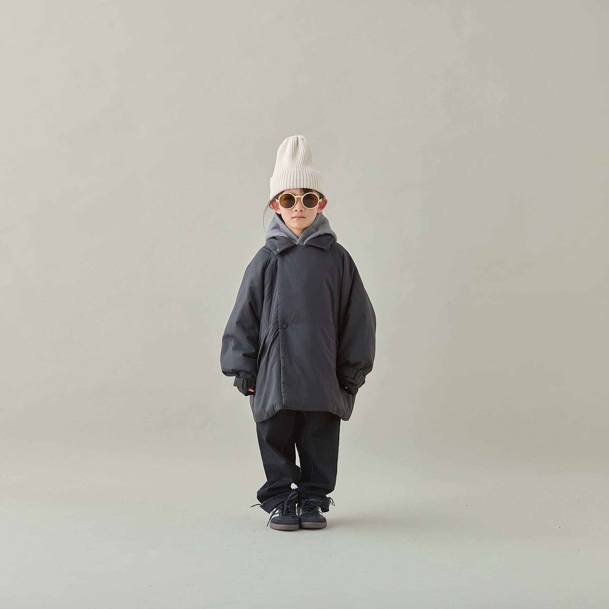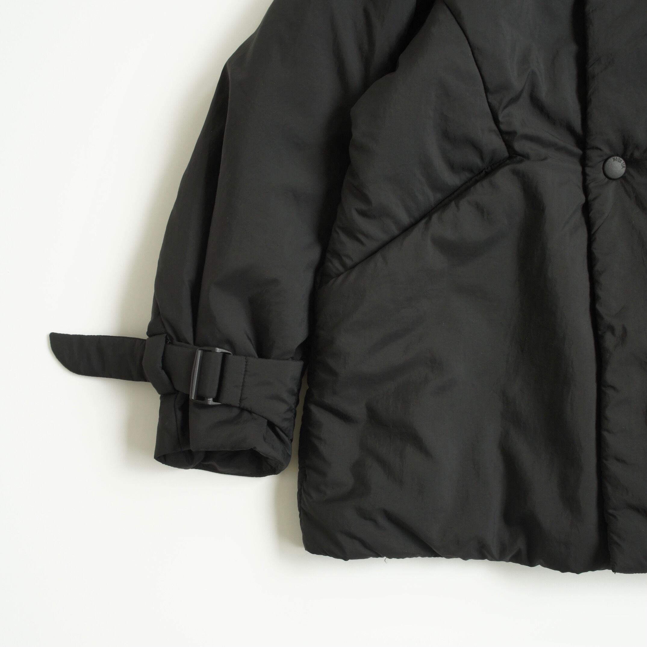オーセンティックなダブル仕立てのハーフコートを、ゆったりとしたシルエットと軽量なナイロン素材の中綿入りにすることで、とても軽く暖かくフワッとしたボリューム感とリラックス感のあるスタイリッシュな雰囲気になっています。