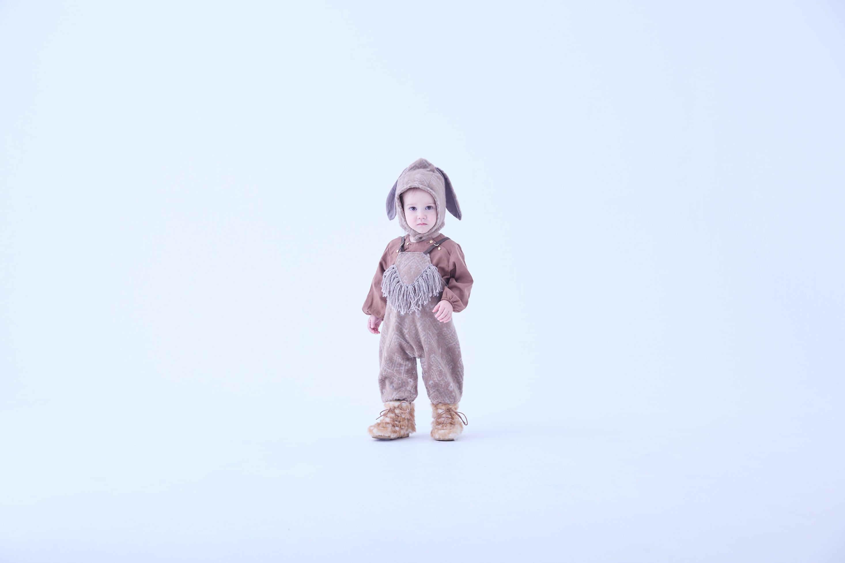 ベビーロンパースは胸元にウールフリンジをデザインし、華奢な肩紐は背中までまわり、後ろウェストはゴムギャザーでゆったりしたヒップまわりがベビーらしい1着。股下のスナップ付きでおむつ替えに便利です。