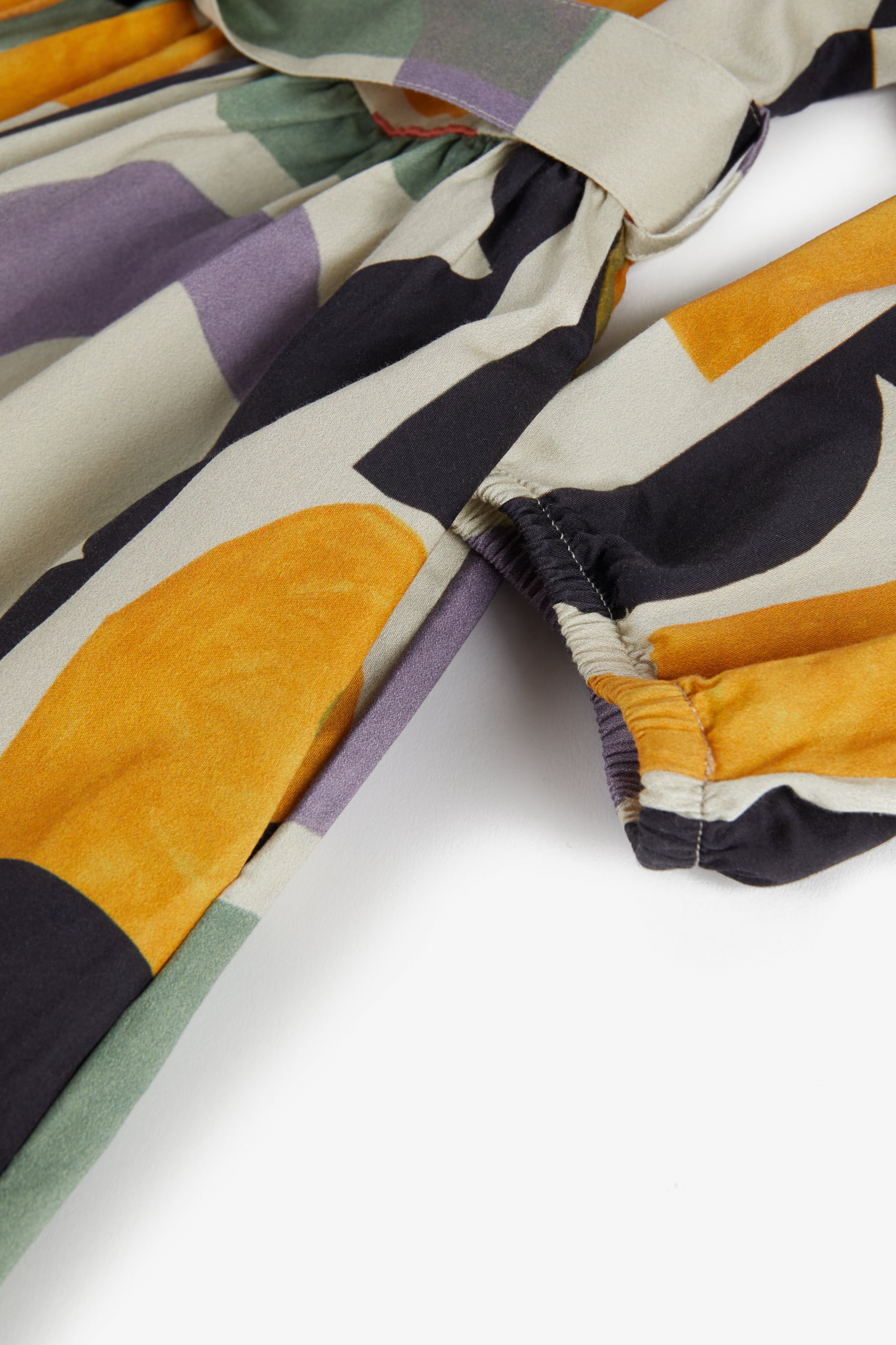 特徴:ジオメトリック柄/長袖/ウエストリボン付き/前開きボタン/ロング丈