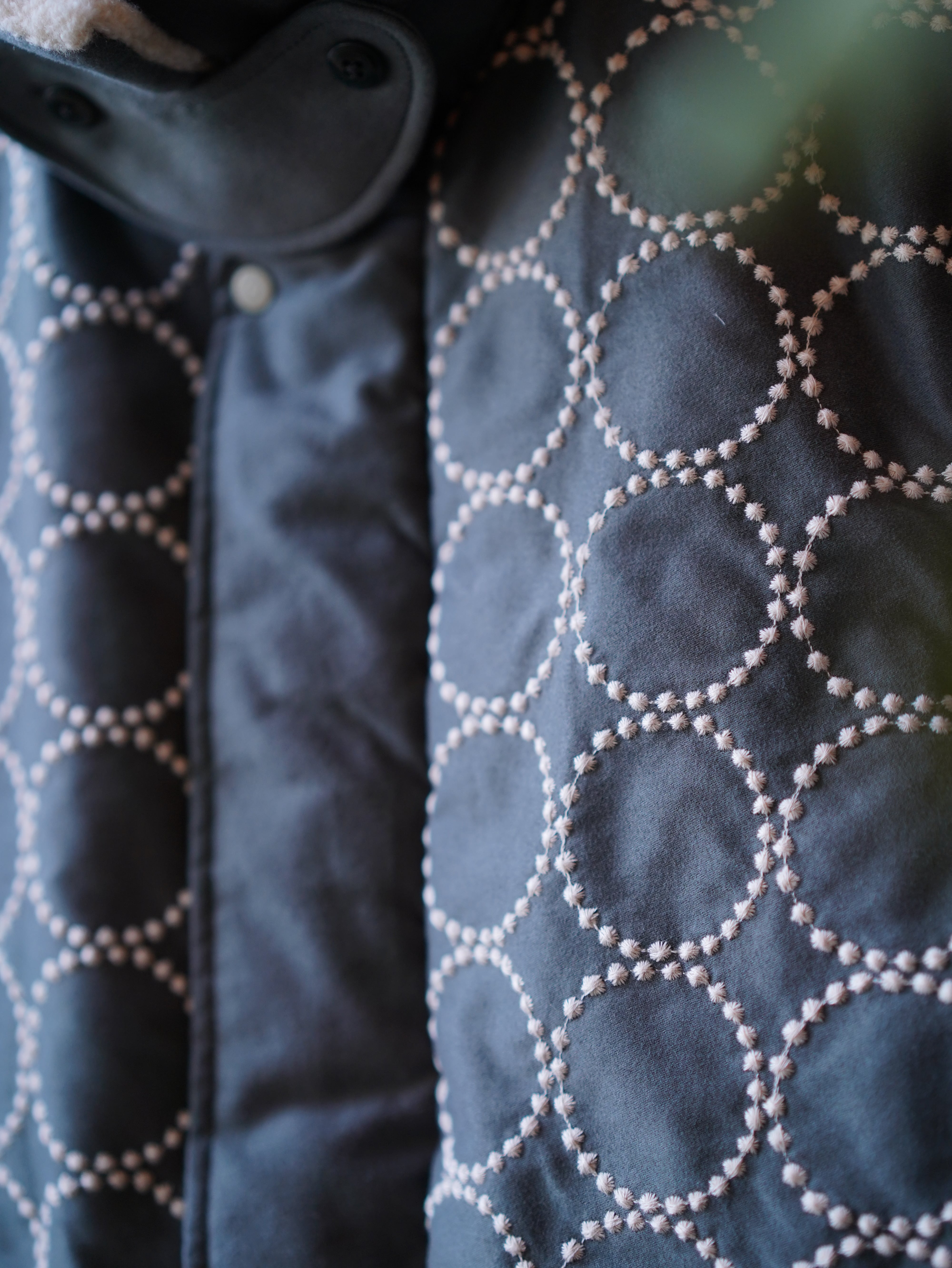 身頃の前立てや袖口の切り替えが凛とした印象を生み、寒さの中にも静かな気品を感じさせます。