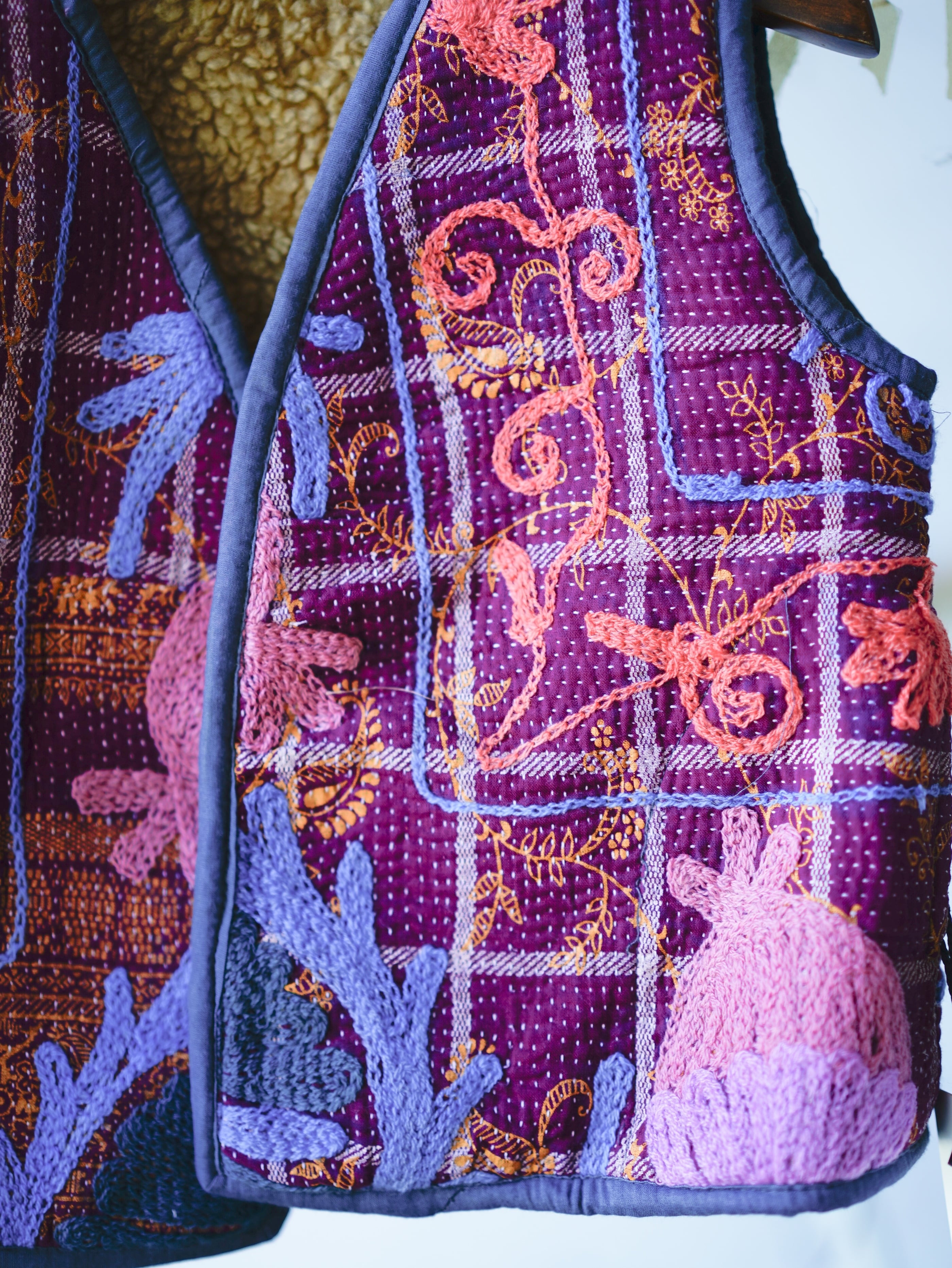 軽やかなインド綿をベースに、カンタ刺繍が丁寧に施された一点もののパッチワーク。ひと針ごとに刻まれた時間が、布の記憶を静かに語ります。