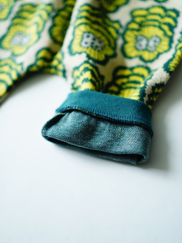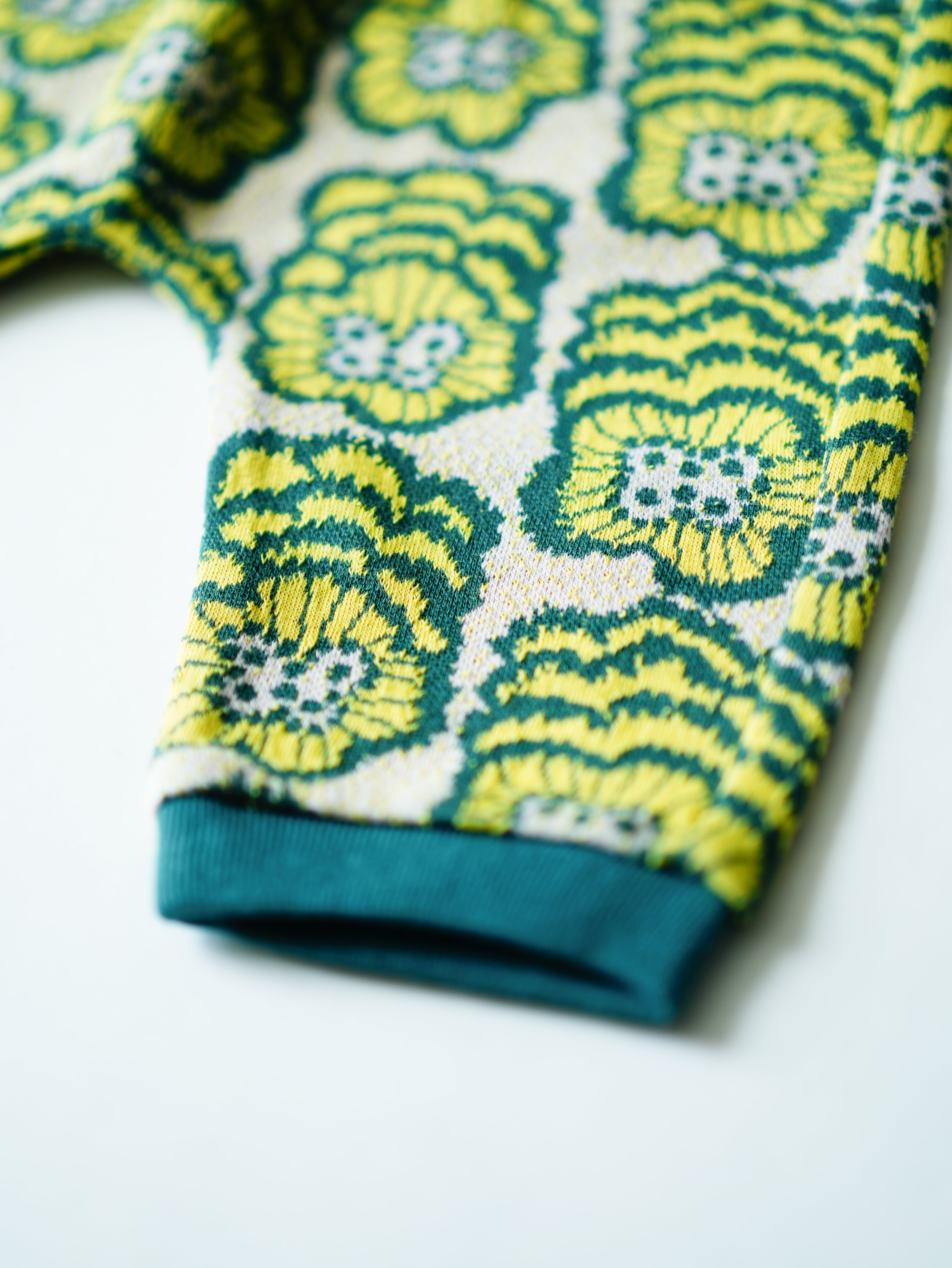 花びらが四枚、重なり合いながら織り上げられた “happy bloom(ハッピーブルーム)”。ちょうちょのように揺れる花芯や、露を受けて光る花びらの表情を、立体的なジャカード織りで描いています。花びらの部分には小さな空洞をつくり、ふくらみのある柔らかな風合いに仕上げました。ベビーのためのパンツは、軽やかで肌にやさしく、赤ちゃんの一日の動きにそっと寄り添います。笑顔の時間も、眠る瞬間も。この小さな布の中に、やわらかな空気が流れます。mina perhonenが思い描くのは、100年先まで続く日々のぬくもり。“happy bloom” の花が、今日という小さな時間をやさしく包み込みます。