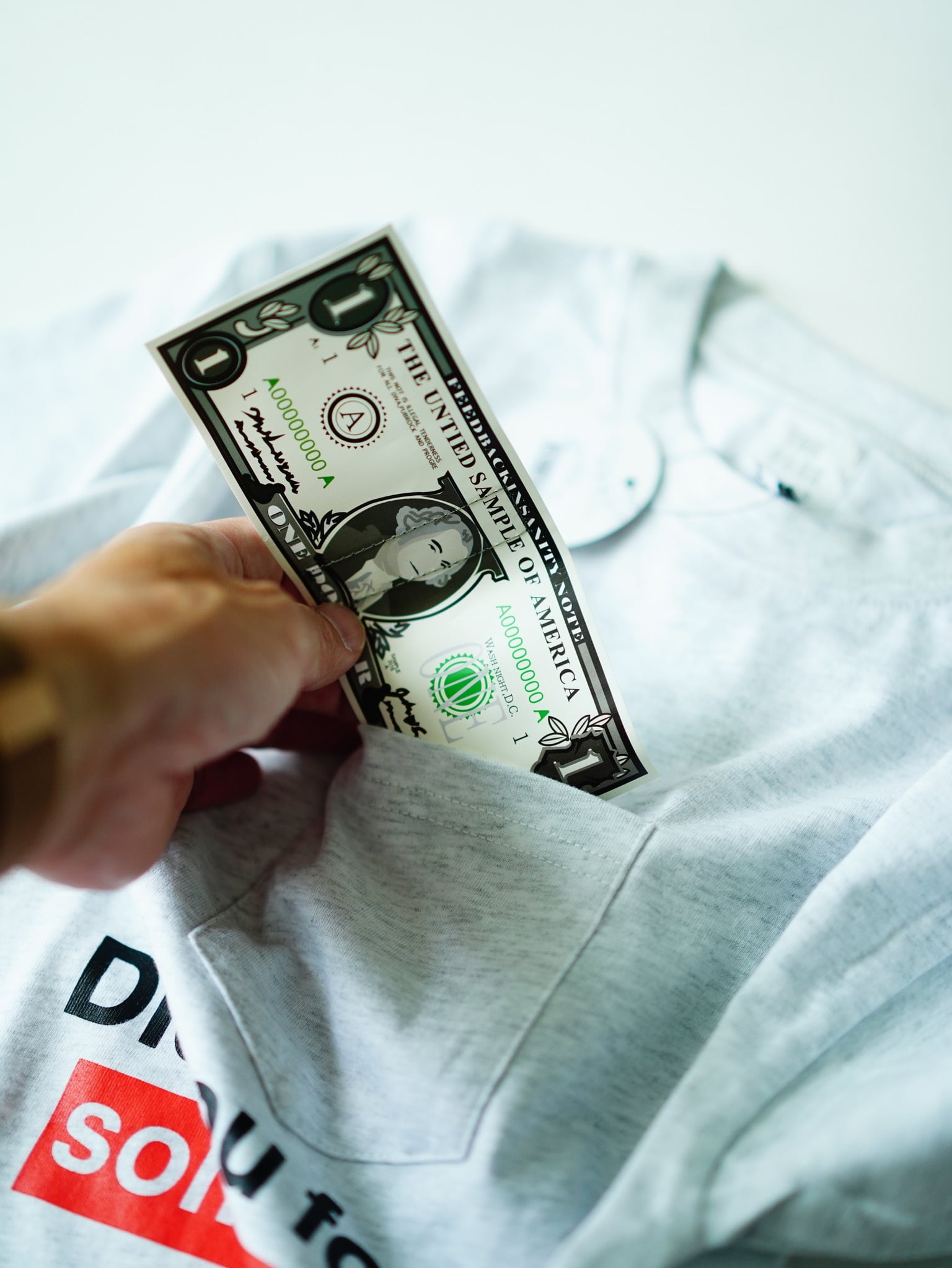 ポケットから、ひらり。まるで映画のワンシーンみたいに“ドル札”が飛び出すロンTです。実はこのドル札、紙のような質感を持った異素材でできていて、ベルクロで つけたり外したりできる“遊べる仕様”。お金をしまう動作だけでなく、「友達に渡す」「自分で見せびらかす」「ごっこ遊びが始まる」など、想像のスイッチが一気にオンになる仕掛けです。