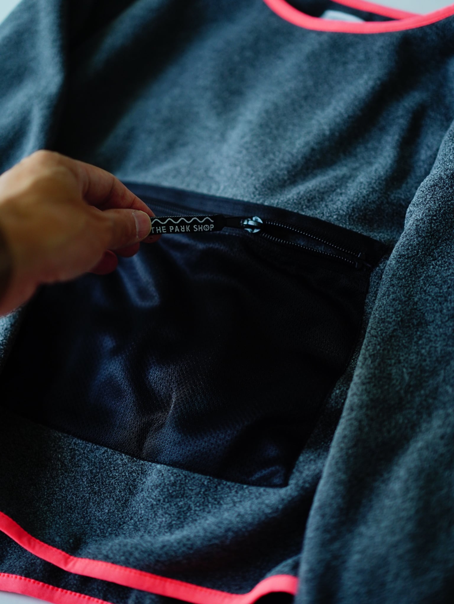 フロントには大きなジップポケット。小さな宝物を入れてもいいし、手をあたためてもいい。デザインのアクセントでありながら、ちゃんと機能的なところがTHE PARK SHOPらしいポイント。