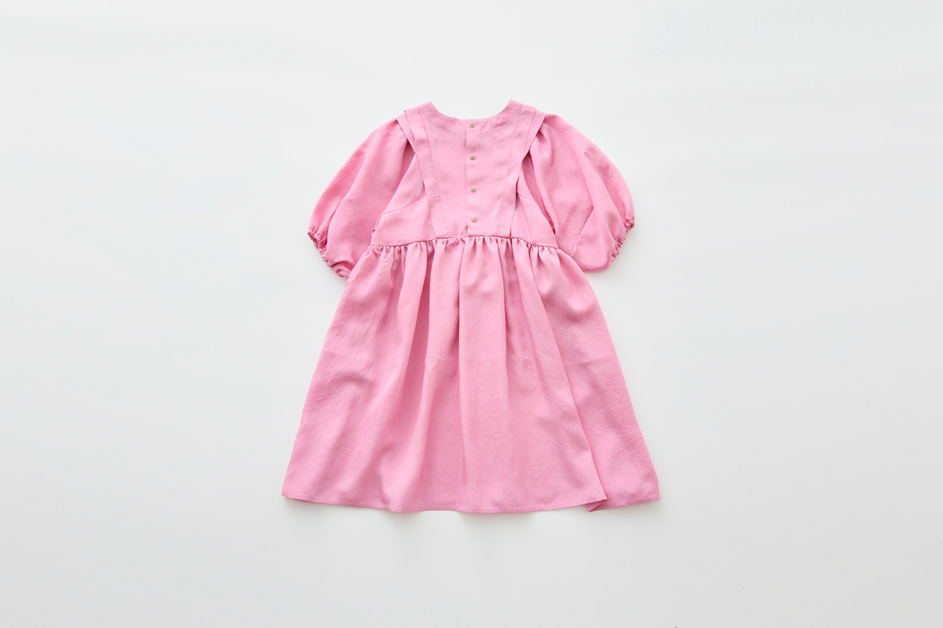 華奢な肩幅と、量感をもたせた七分袖のギャザースリーブが、