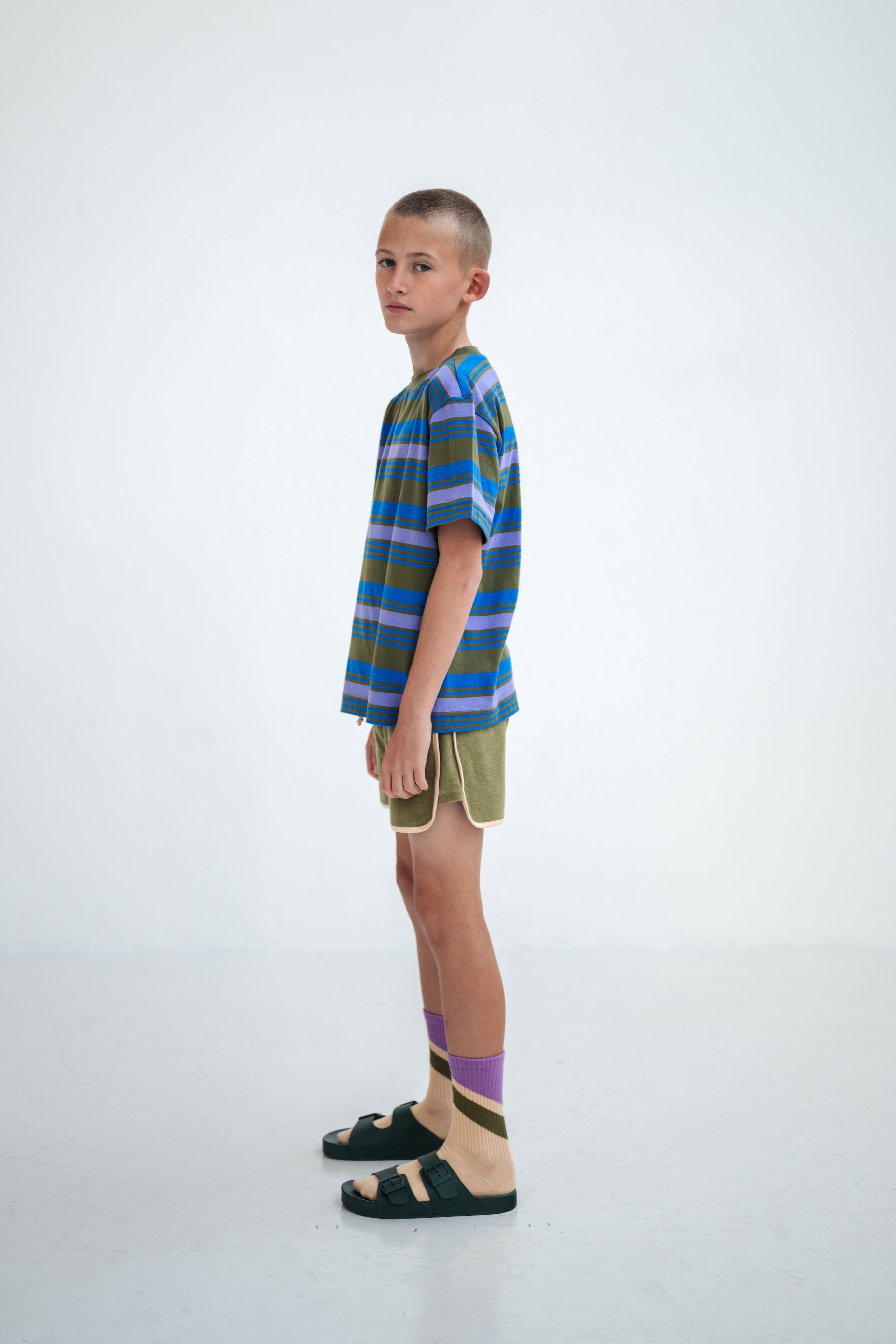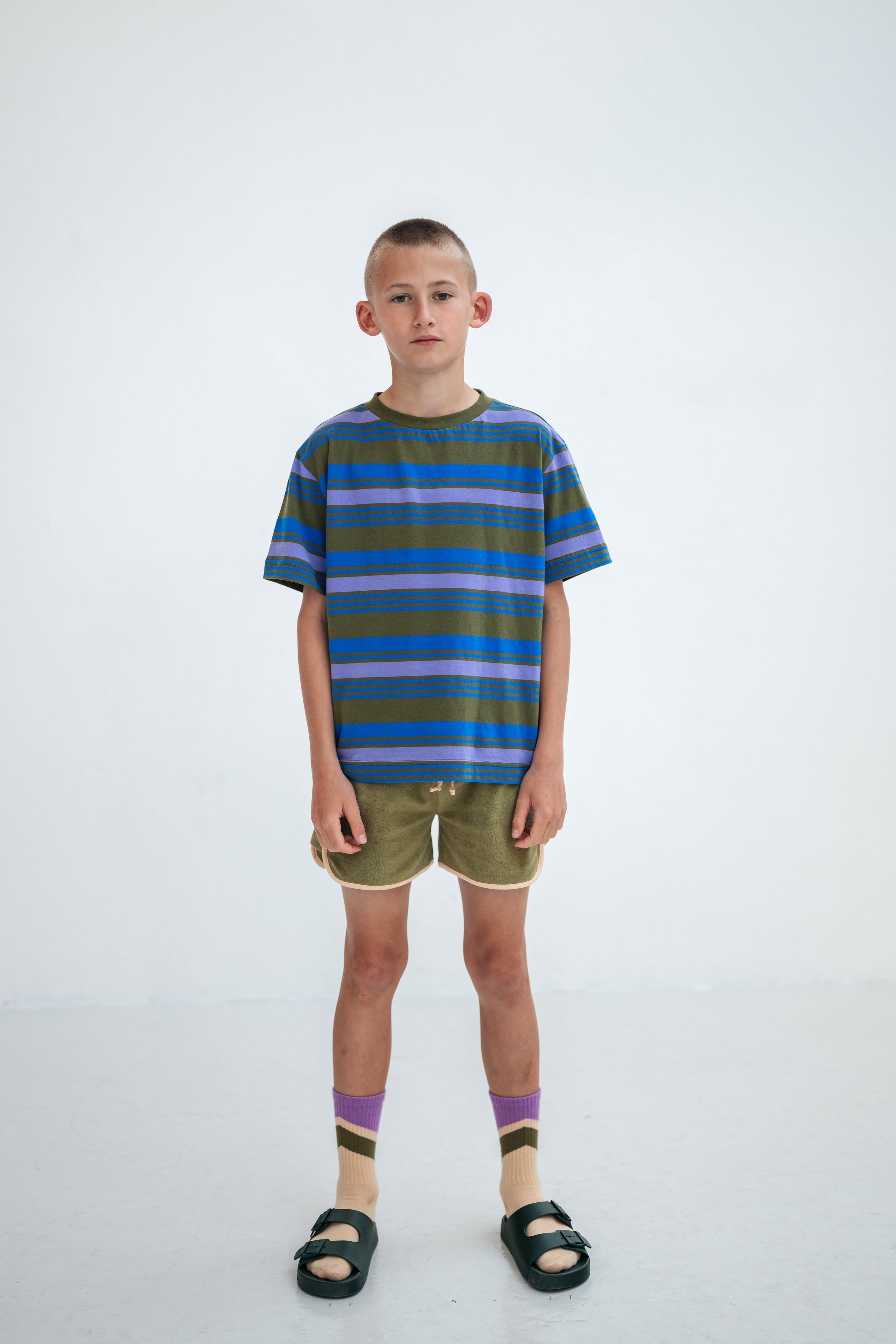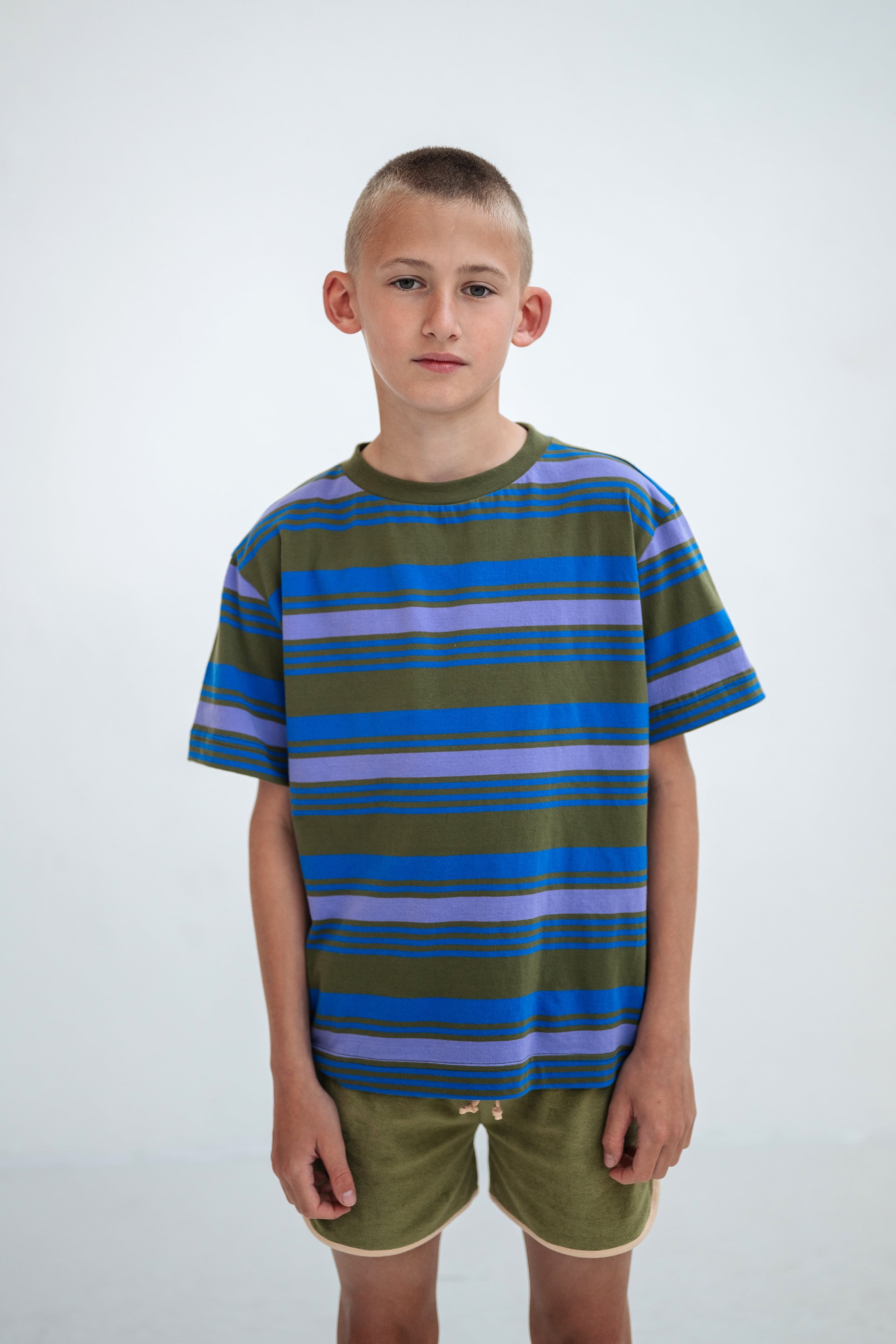 鮮やかなカーキ色のブルームストライプ柄が特徴のこのTシャツは、大胆なカラーコントラストでノスタルジックな80年代スタイルを演出します。100%オーガニックコットンを使用し、ボックスシルエットのストレートカットシルエットに仕上げました。カーキ、ブルー、パープルの鮮やかなストライプが、レトロな雰囲気と存在感を放ちます。