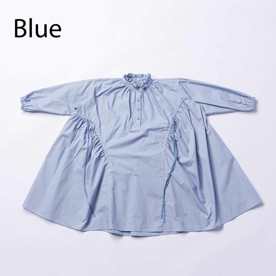 フロントには小さめのボタンが並び、スタンドフリルカラーが女性らしさをプラスします。サイドのギャザーは調節可能なドローストリング仕様で、シルエットの変化を楽しめます。袖口にはゴムが入っており、ふんわりとしたボリューム感がポイント。