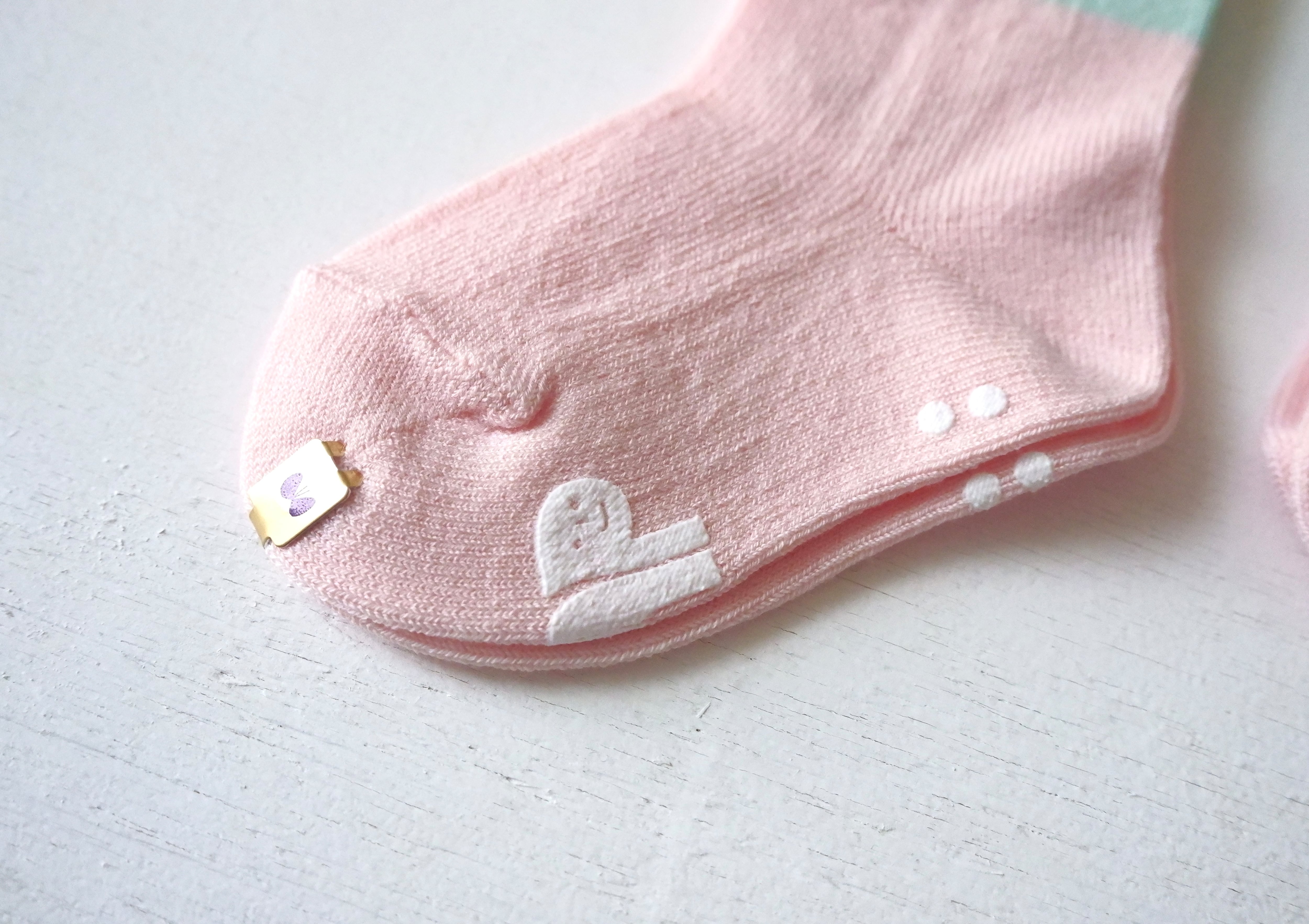 足裏には、mina perhonenの“m”と“p”、ちょうちょをかたどった滑り止め付きで、はいはい期や歩き始めの赤ちゃんにも安心です。