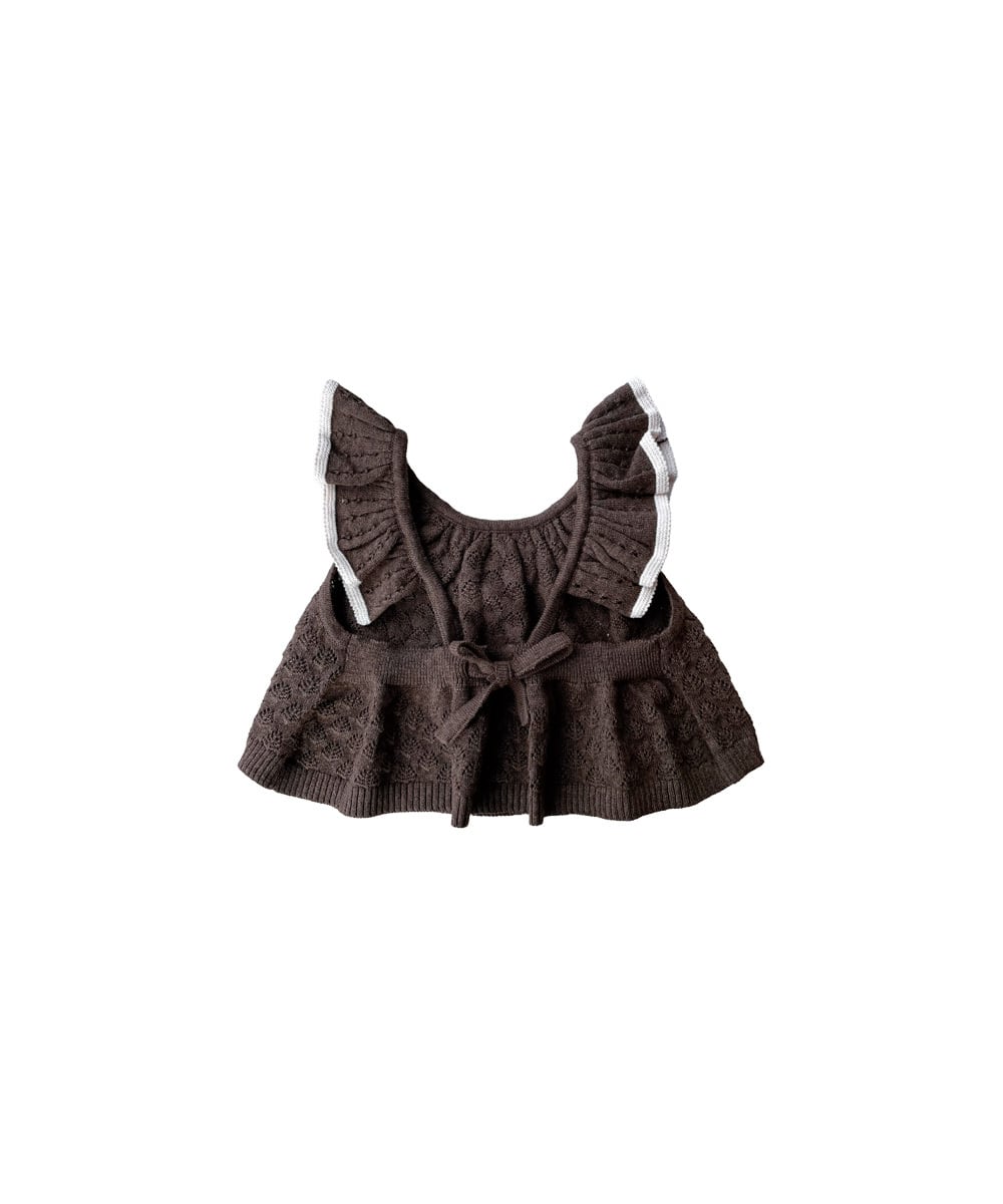 フリルのネックラインとストラップが可愛らしいAラインのベストは、背中で結ぶ調節可能なリボン仕様。ブルマは丸みのあるバブルシルエットで、フリルのディテールとやさしくフィットするゴムウエストが特徴です。