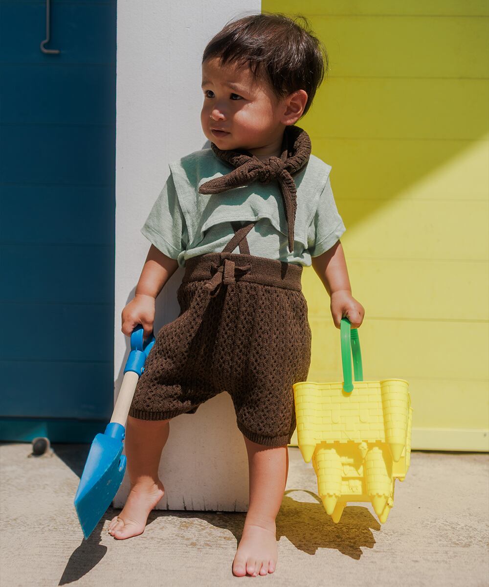バックでクロスするストラップが特徴のショートパンツ。フロントで結んで調節できるデザインです。