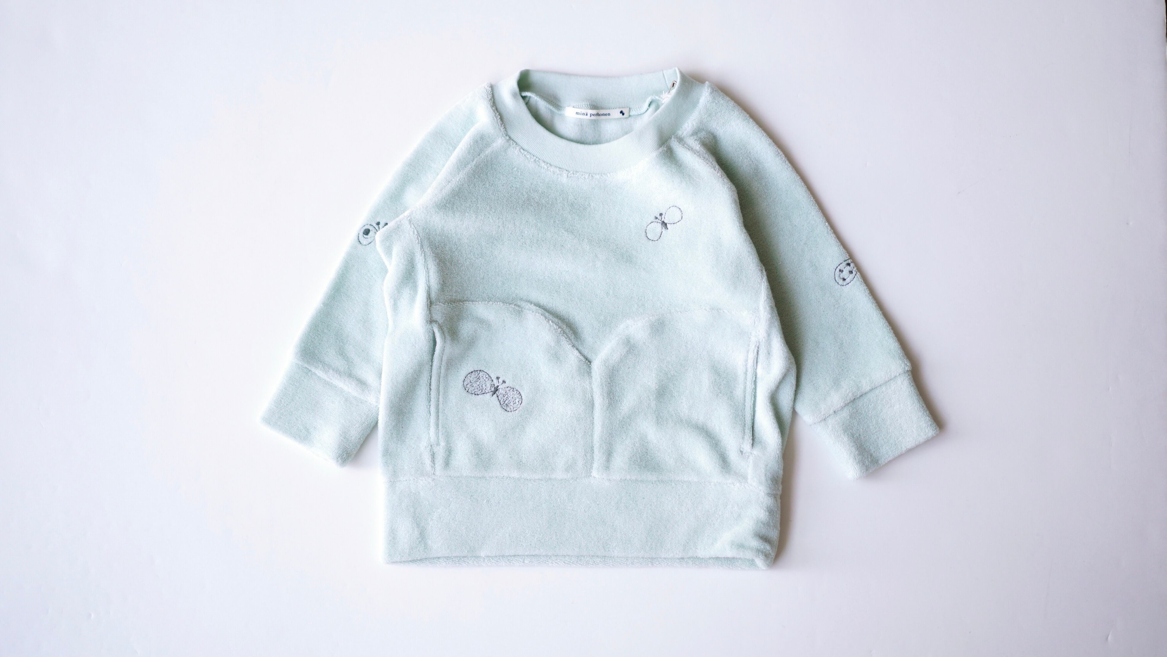様々な模様のchouchoがゆるやかにに空間を跳んでいる様子を図案にした ”choucho” のプルオーバーです。 ふんわりとあまめに撚ったコットン糸で編み上げたパイル素材のカットソーシリーズ。太陽の光を存分に浴びて柔らかさを蓄えたふわふわのタオルのような素材です。柔らかな発色はまだあどけない赤ちゃんの肌に似合う優しい雰囲気に。chouchoに包まれたお子様が”ハイハイ”やスヤスヤと眠る姿は、過ごす時間を喜びの思い出として包んでくれそうです。