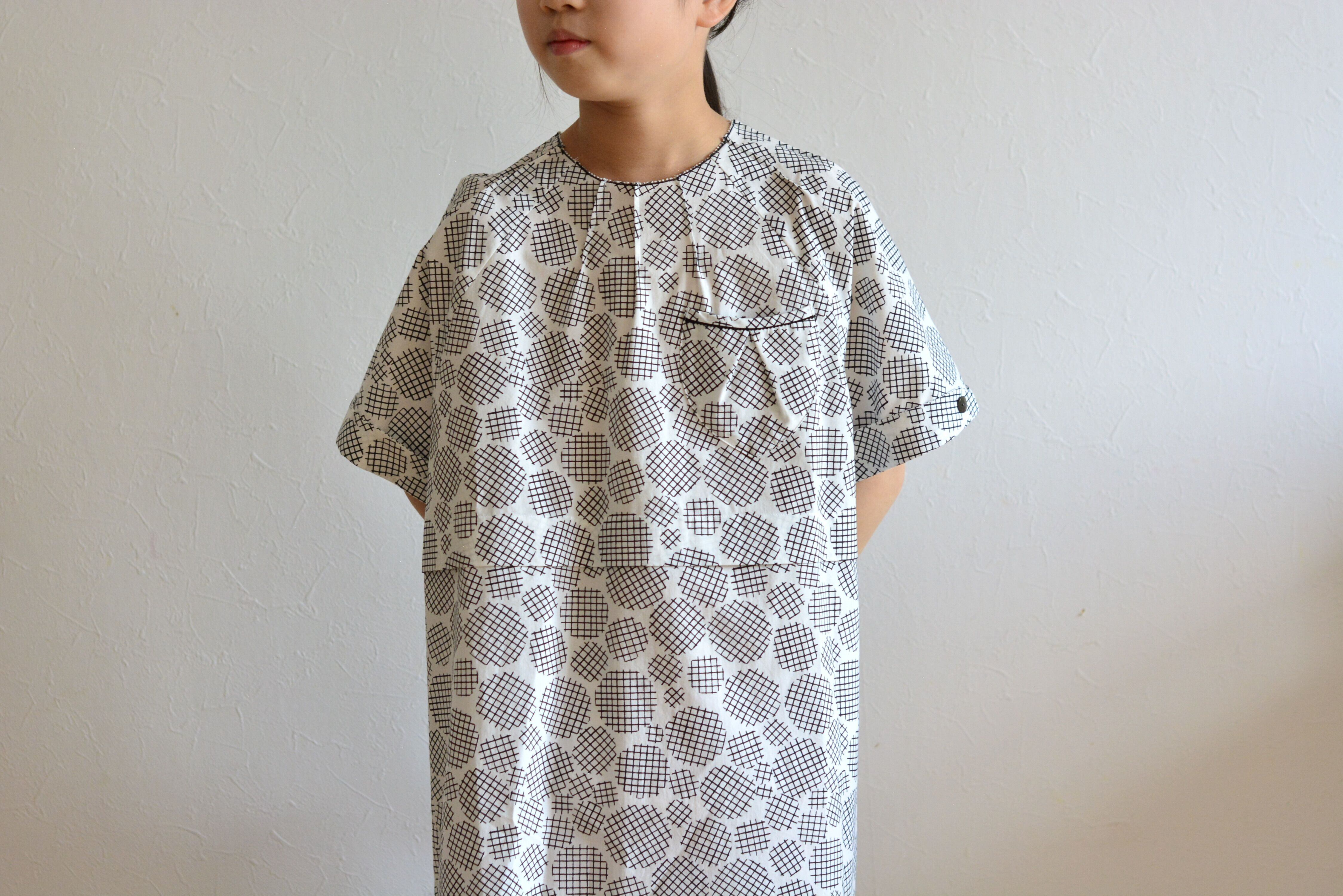 皆川さんが絵筆で一本ずつ描いた線を、絵の手仕事の優しさのあるチェック柄をまじえてビスケットで型取りました。 水玉のように表現した男の子向けのワンピースです。