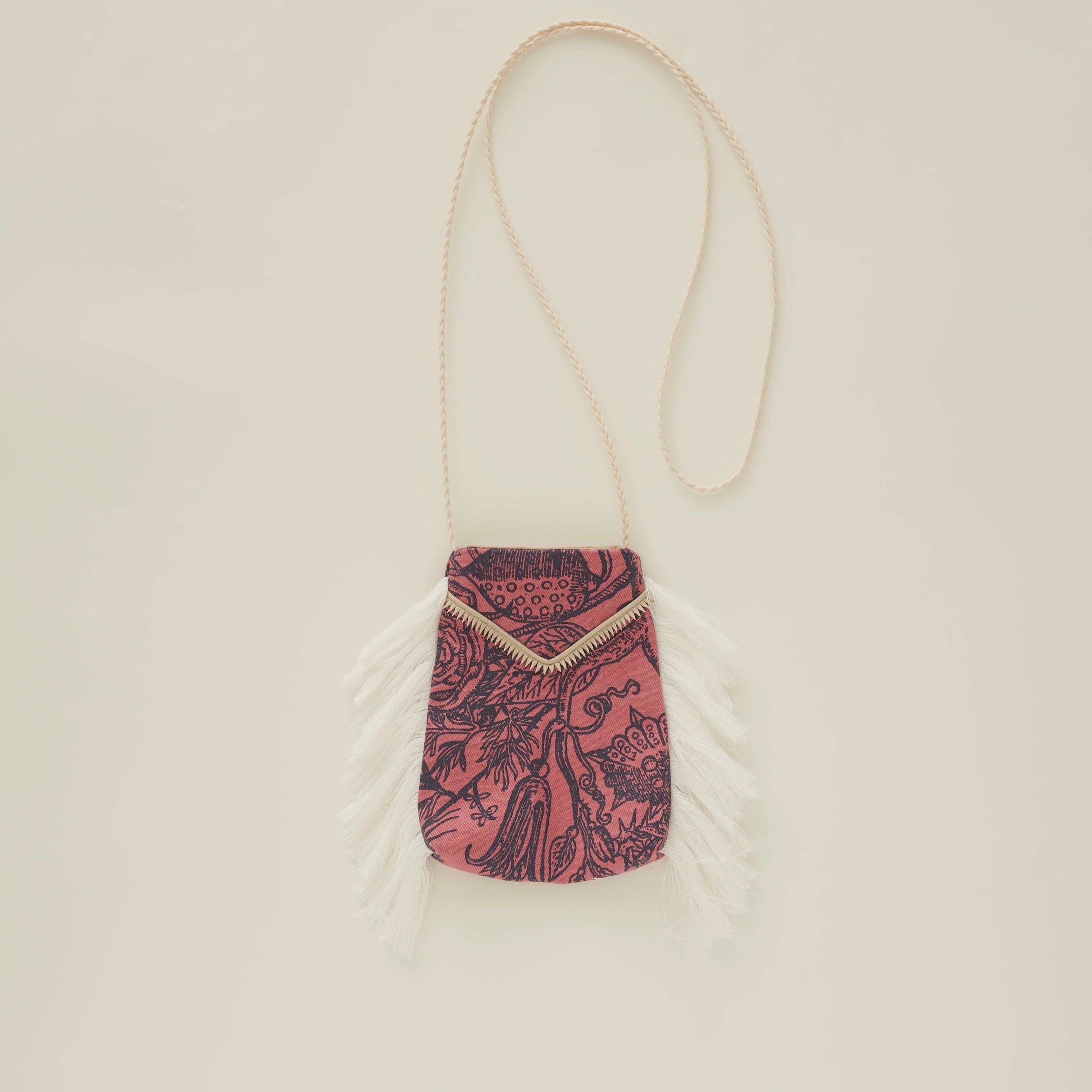 親子で共有できる携帯サイズのフリンジ付きポシェット。花の妖精FLORAは、頭にたくさんの植物が生え、足には根っこがある妖精。 そんなFLORAを空想してコラージュで描いた図案をプリントしたテキスタイルで、今季は2種類の生地を展開。 こちらのポシェットは、中肉のコットンツイル(Twill綾織)にプリントしたテキスタイル。コットンフリンジは京都のレース工場で糸から作っています。今季のテーマのものがたりを表現したシリーズです。