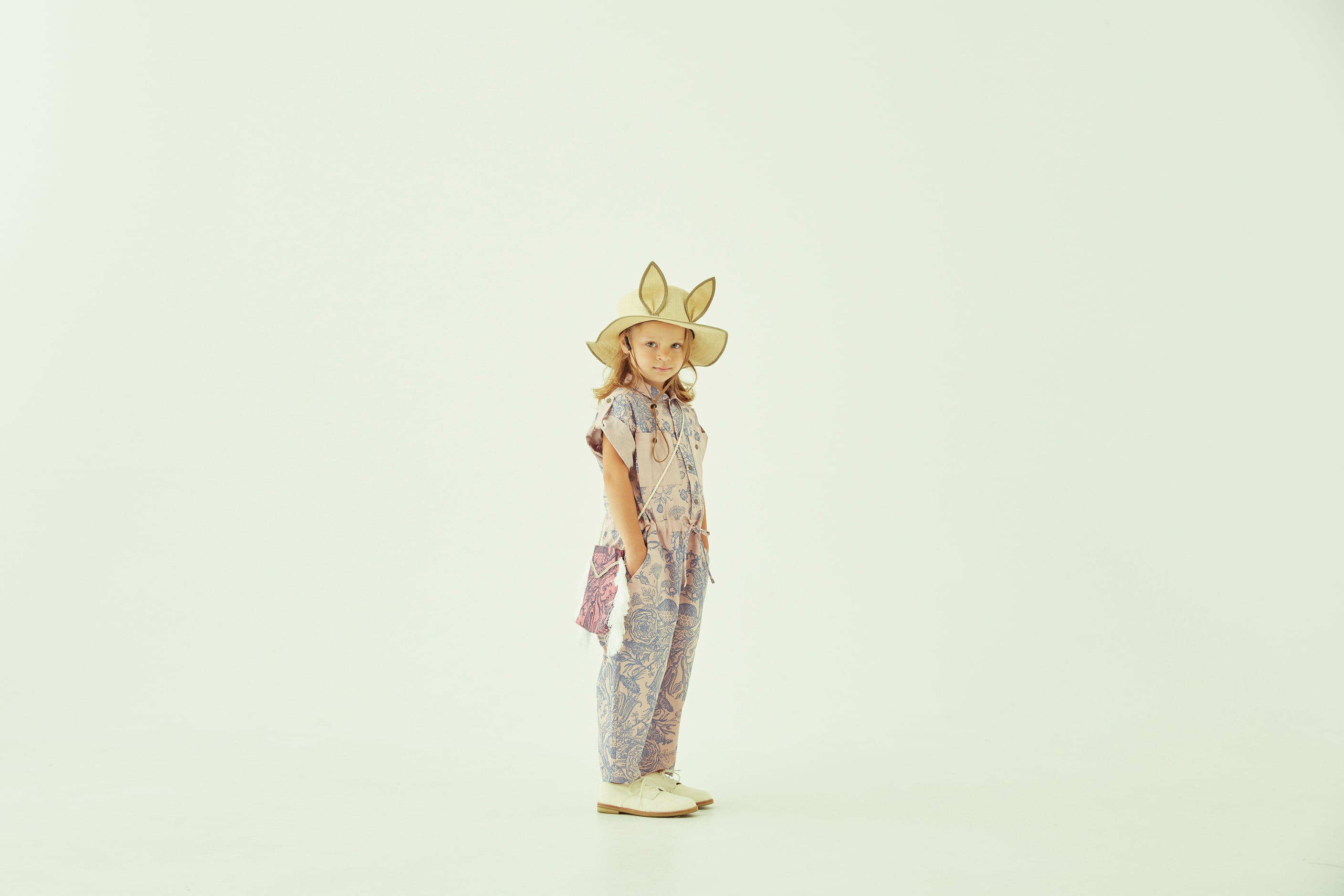 毒草も薬草もその身に植生する妖精フロウラをコラージュで描いたオリジナル図案をプリントしたテキスタイルのつなぎやサスペンダーパンツ、老舗帽子ブランドCA4LAとコラボレーションした耳付きのガーデンハットを合わせた、薬草園の庭師のようなスタイル。レトロでノスタルジックな花柄のエプロンドレスやボリュームスリーブドレスのガーリーアイテムやグラフィカルな図案のTシャツなど、日常の中にeLfinFolkのものがたりを添えるコレクションです。