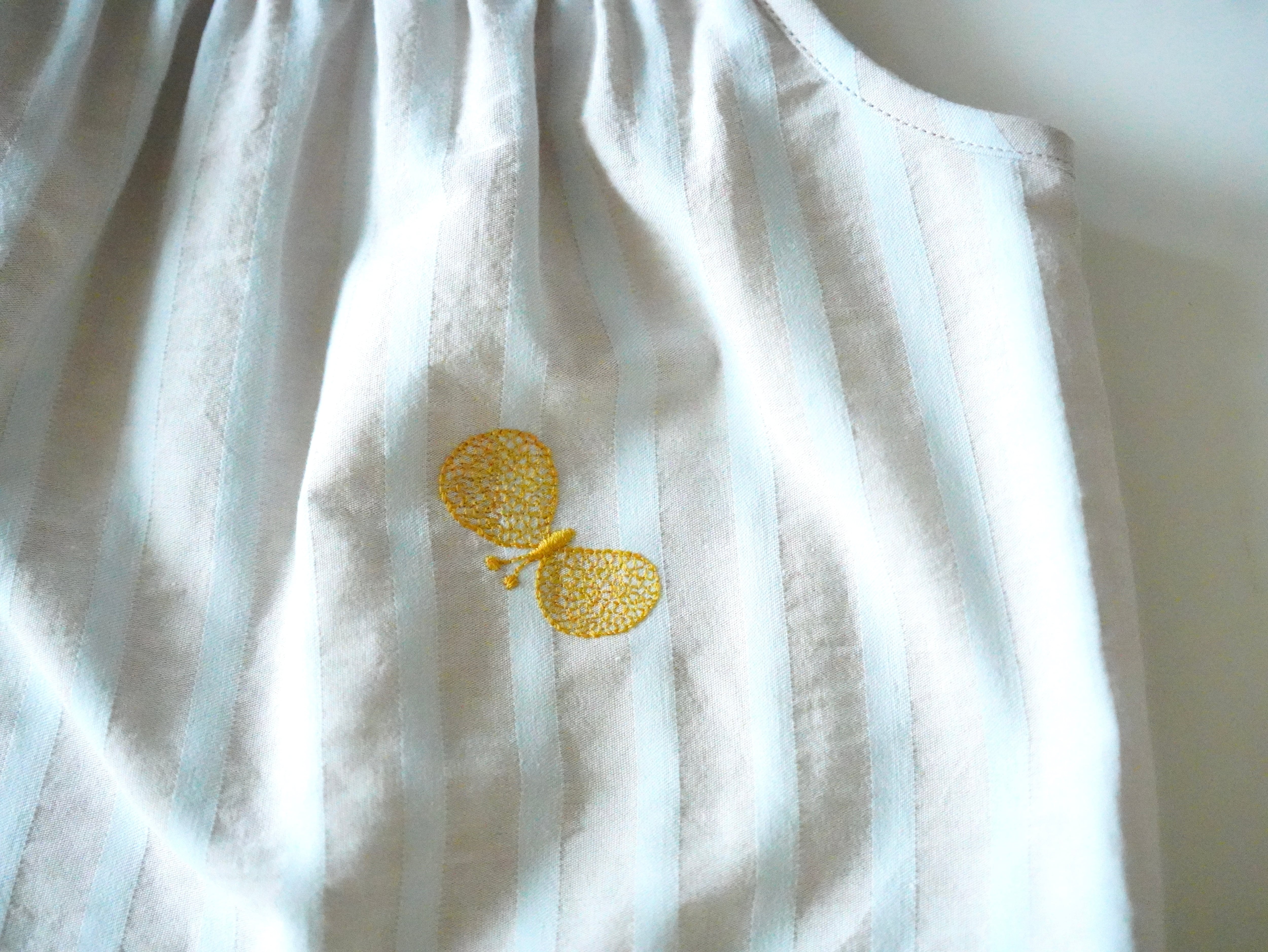 2001年初夏コレクション以来、20年以上に渡り愛されているテキスタイル “choucho”。 空間を自由に飛び回る紋黄蝶が、一羽ずつ、個性あふれる刺繍で表現されています。 ストライプをベースしたテキスタイルで、刺繍がそれぞれ異なる織物の組織や色使いが、穏やかな空間と動きを感じさせるデザインが特徴的です。こちらのキャミソールは、真夏の暑い日に一枚で着られるほど軽やかな素材で、半袖のカットソーやTシャツとのレイヤードスタイルもおすすめです。カラーは、イエロー、ライトピンク、ライトブルーの3色。同じ生地で帽子もご用意しています。