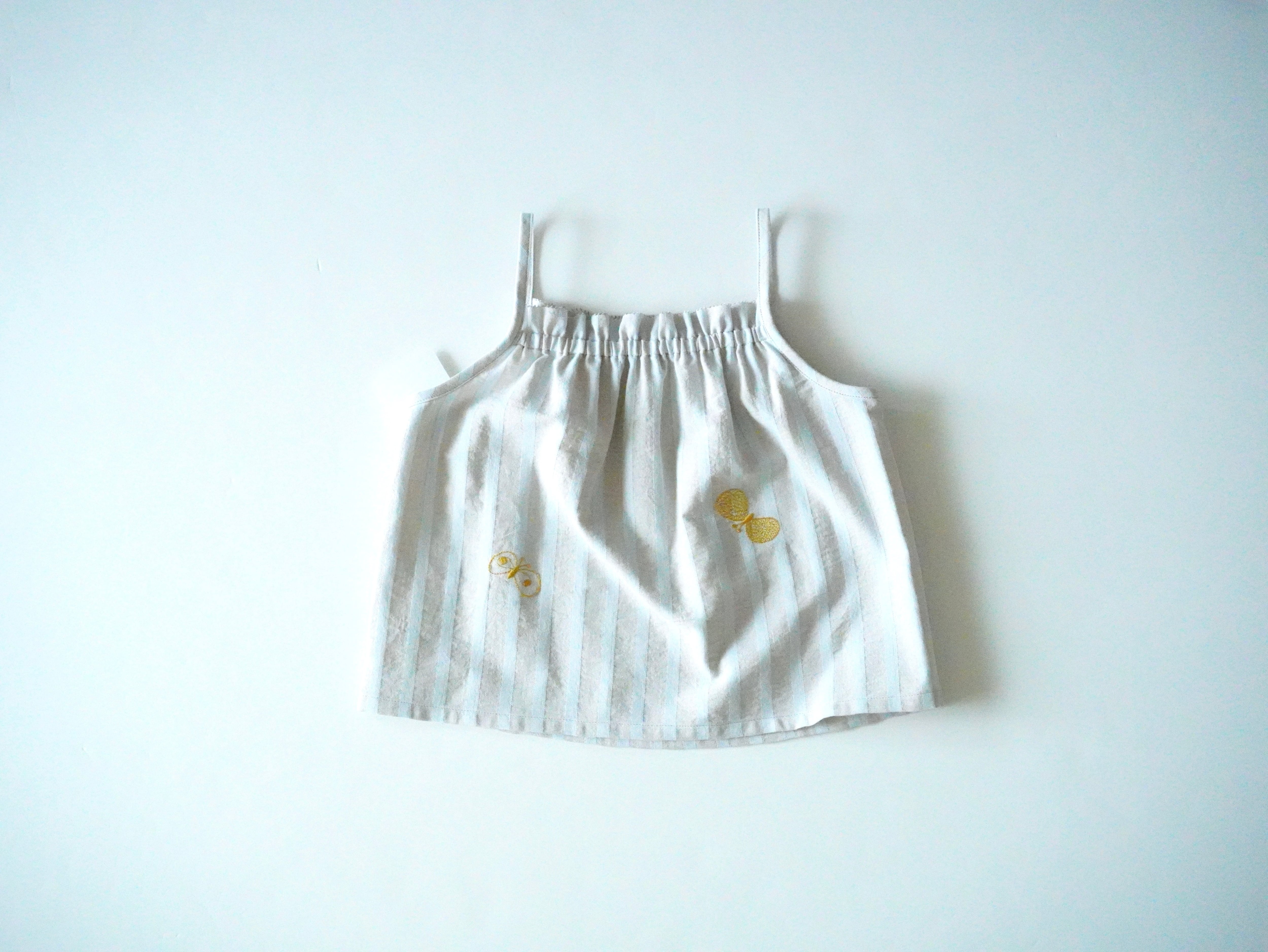 2001年初夏コレクション以来、20年以上に渡り愛されているテキスタイル “choucho”。 空間を自由に飛び回る紋黄蝶が、一羽ずつ、個性あふれる刺繍で表現されています。 ストライプをベースしたテキスタイルで、刺繍がそれぞれ異なる織物の組織や色使いが、穏やかな空間と動きを感じさせるデザインが特徴的です。こちらのキャミソールは、真夏の暑い日に一枚で着られるほど軽やかな素材で、半袖のカットソーやTシャツとのレイヤードスタイルもおすすめです。カラーは、イエロー、ライトピンク、ライトブルーの3色。同じ生地で帽子もご用意しています。