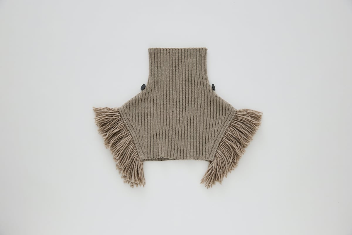 アクリルウール糸で編まれたリブニットのタートルネックケープ。