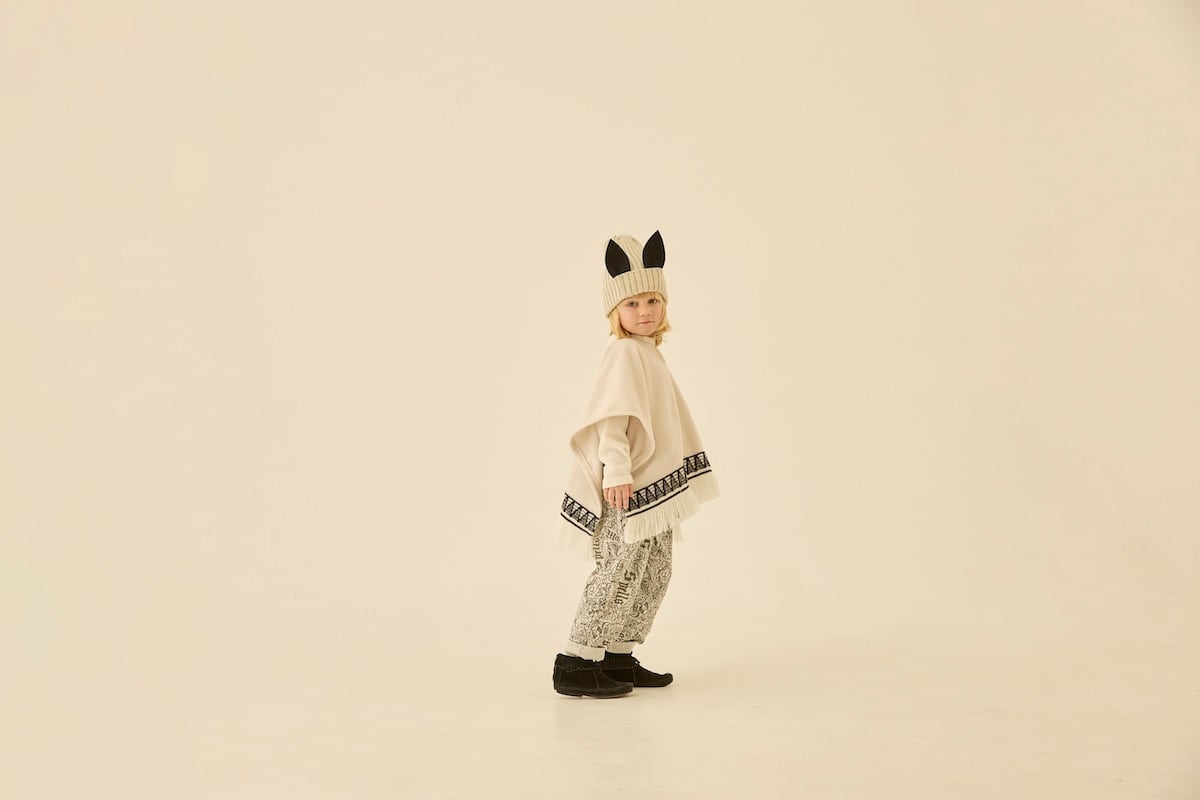 魔女のマントのようなとんがりフードの黒いコートや、ドラゴンを倒す呪文が散りばめられたオリジナルプリント、魔法学校の制服のようなエンブレムポロシャツ、真っ黒いベロアドレス、白黒ボーダーのレギンス、とんがりHATなど、黒をメインカラーにした魔女のようなコーディネートが楽しめるコレクションです。