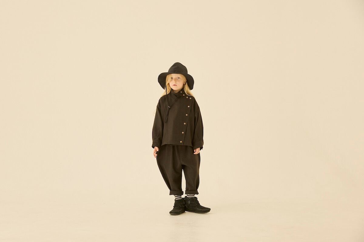 ヘリンボーン柄の織り生地は、サルエルパンツもウールツイード調でオケージョンにもお勧めです。