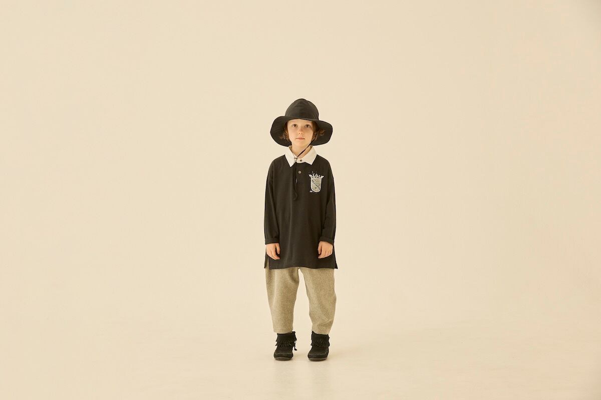 魔女のマントのようなとんがりフードの黒いコートや、ドラゴンを倒す呪文が散りばめられたオリジナルプリント、魔法学校の制服のようなエンブレムポロシャツ、真っ黒いベロアドレス、白黒ボーダーのレギンス、とんがりHATなど、黒をメインカラーにした魔女のようなコーディネートが楽しめるコレクションです。