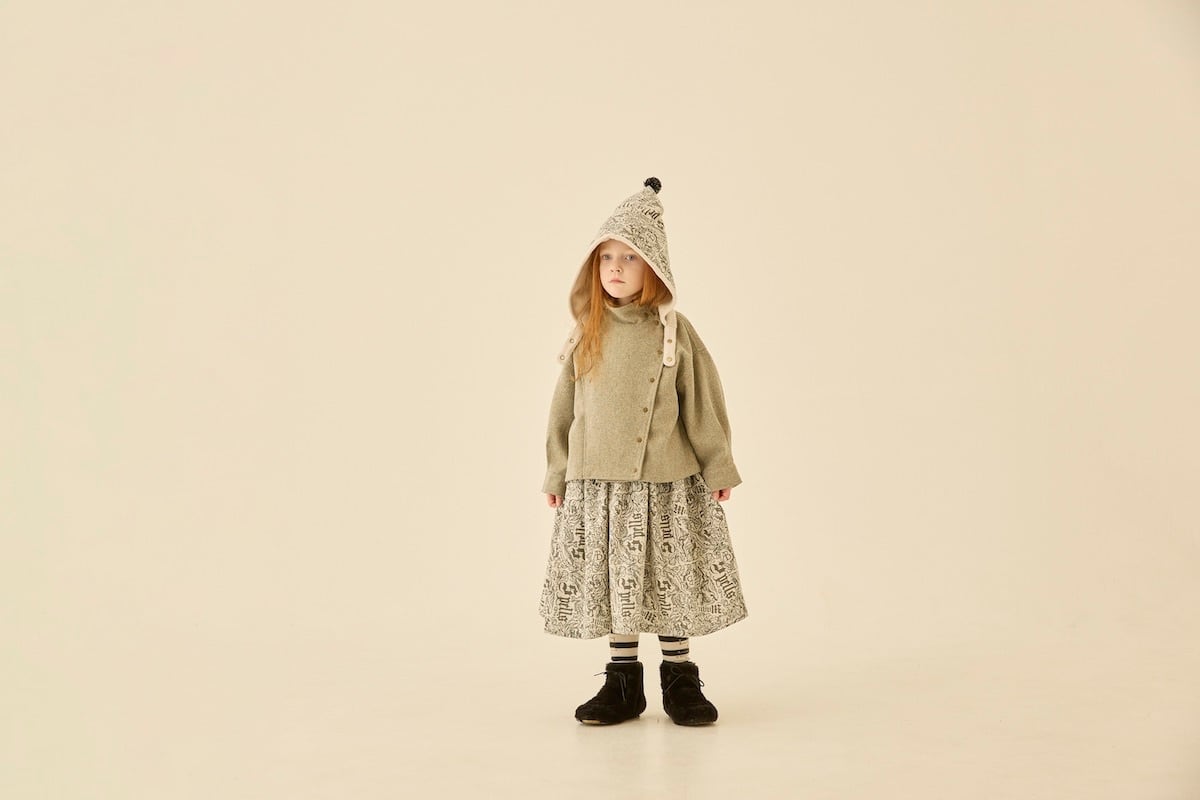 魔女のマントのようなとんがりフードの黒いコートや、ドラゴンを倒す呪文が散りばめられたオリジナルプリント、魔法学校の制服のようなエンブレムポロシャツ、真っ黒いベロアドレス、白黒ボーダーのレギンス、とんがりHATなど、黒をメインカラーにした魔女のようなコーディネートが楽しめるコレクションです。