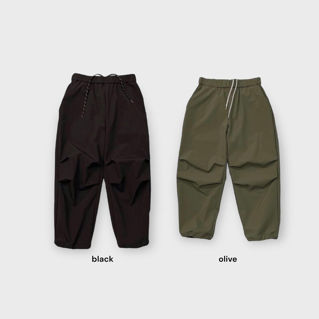 ややワイドで膝にタックの入った立体的なシルエットで動きやすく、裾はドローコードで絞ることができます