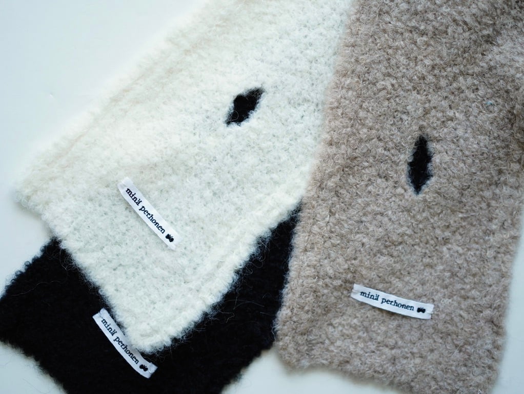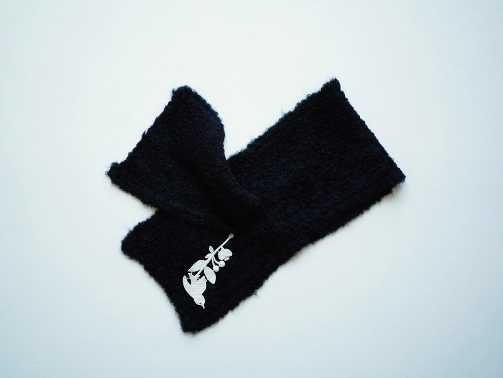 穴を通して首に巻くタイプのマフラーです。大人の方もご着用いただけます。 モチーフには、ミナ ペルホネンを代表する立体刺繍 "forest parade" をモチーフにした鳥と葉があしらわれています。