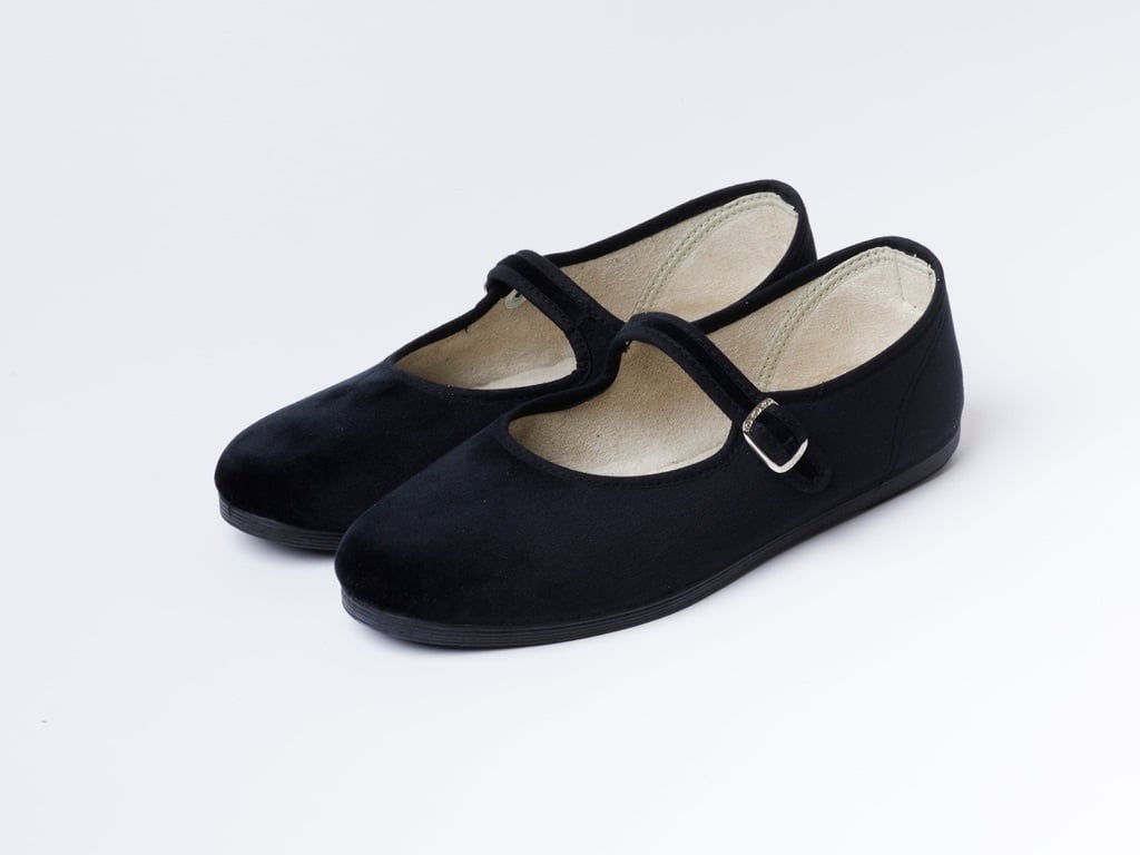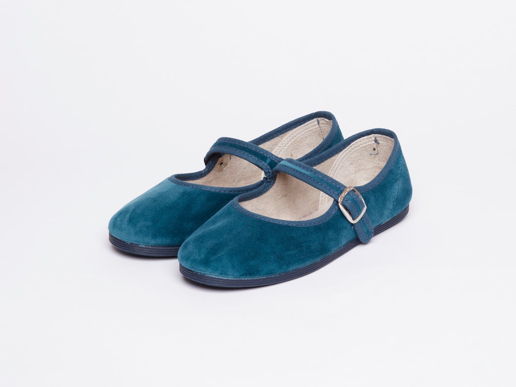 ベロアをあしらったTストラップシューズ。 スペイン東部の130年続く工房で作られるシューズは、上品な雰囲気と履き心地の両方を兼ね備えています。スナップボタンで着脱は簡単に。カカトのロゴ、ボックスデザインも好評いただいています。