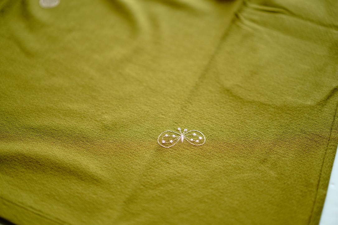 生地の中を蝶々がふわりと舞い、 衣服に空間や動きを感じさせるデザインが特徴です。