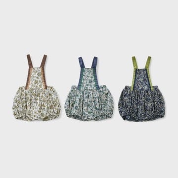 野いばらのような野生の花々をプリントした薄手のコットンローンのシリーズ。薄くて涼しく着心地の良いテキスタイルです。 ベビーサロペットはボリュームたっぷりのかぼちゃシルエットのブルマに胸当てをつけたレトロデザイン。