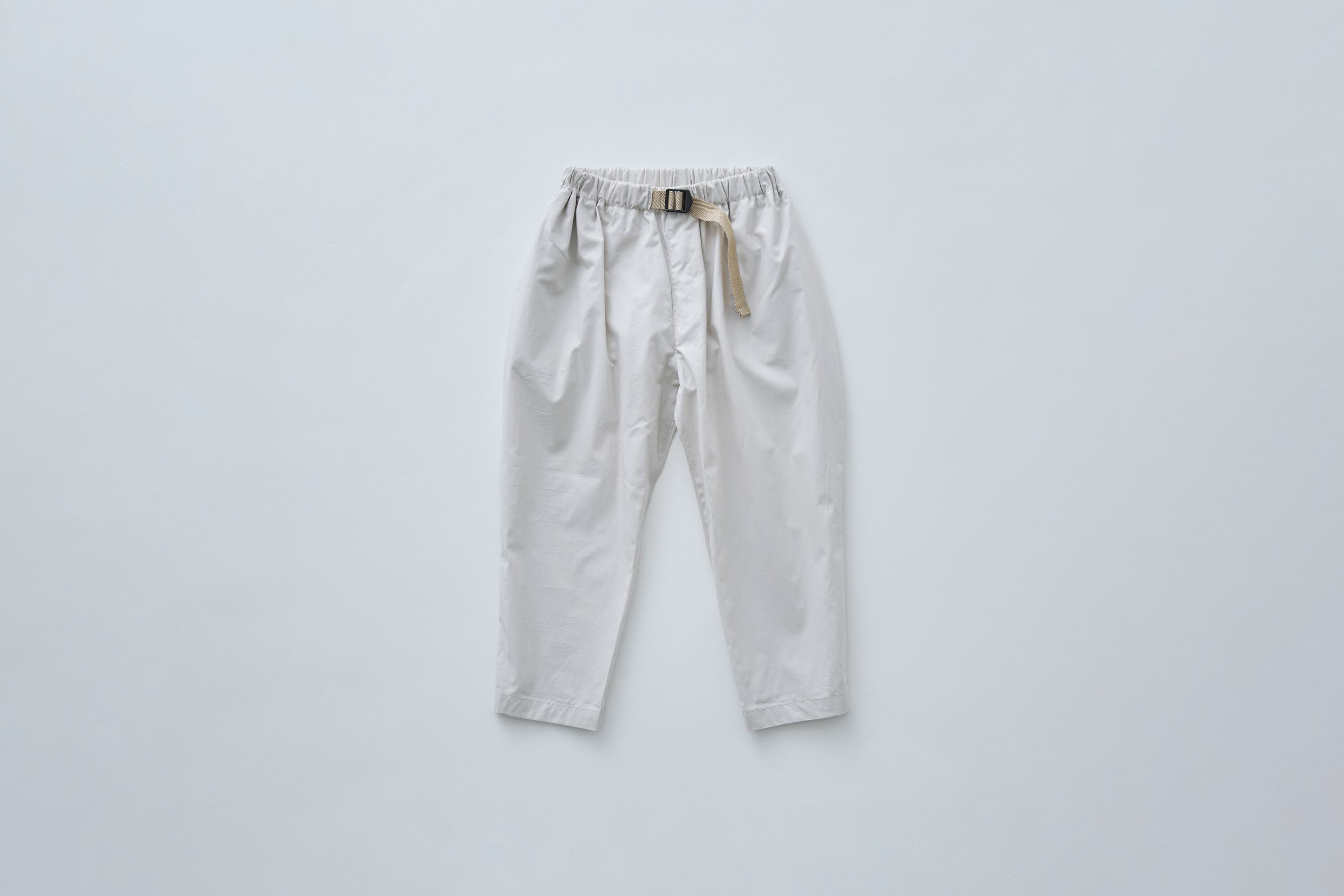 ロングパンツはヒップ周りがゆったりとしたテーパードシルエット、サイズ調整の紐ベルトの色がアクセントに。