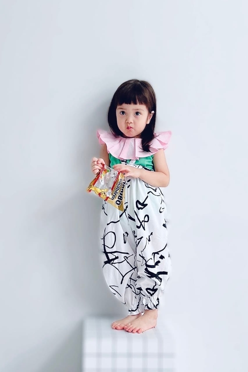 重ね着で袖のフリルがより際立つサスペンダー付きパンツ。